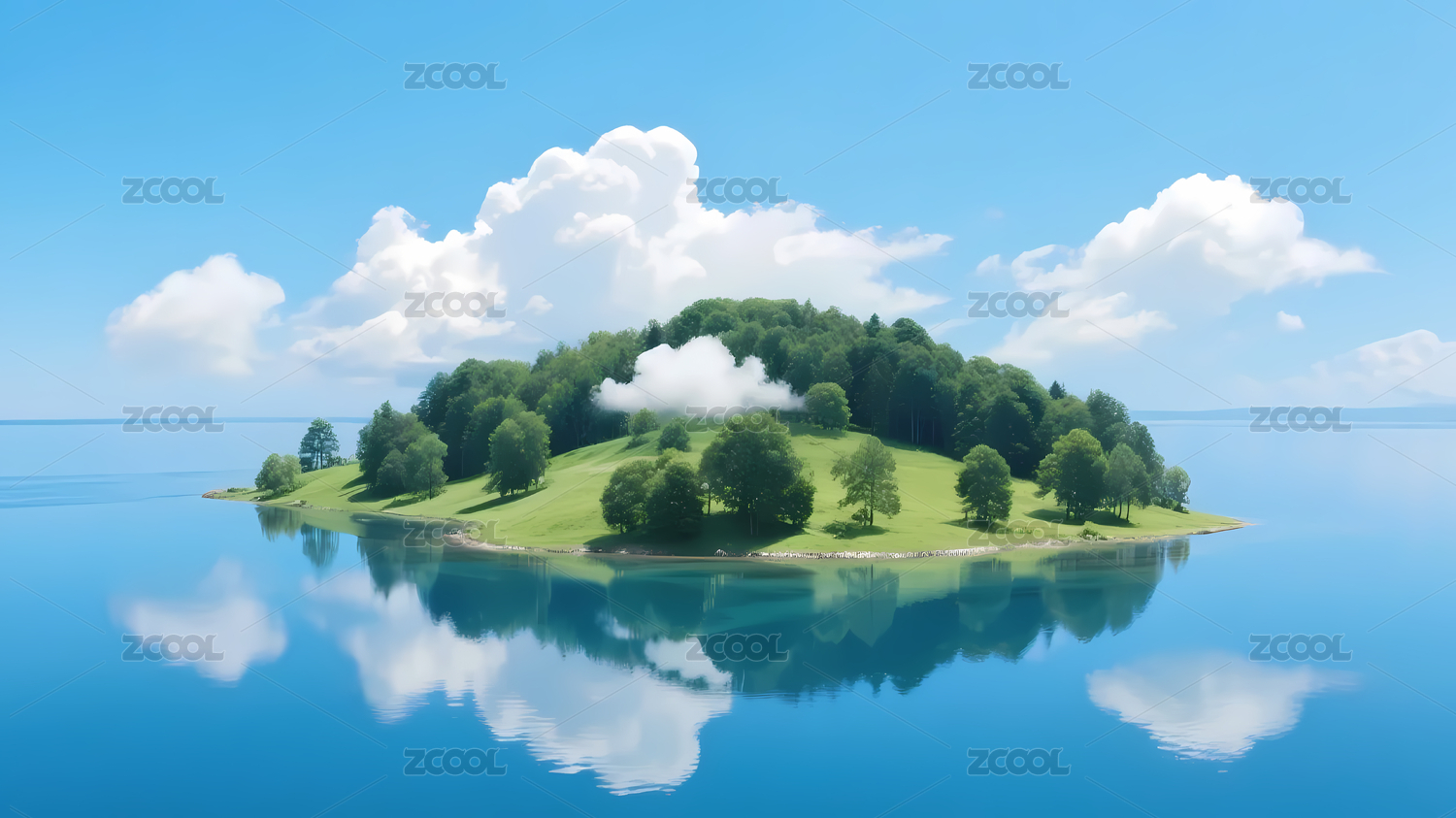 镜面水面映照的绿岛