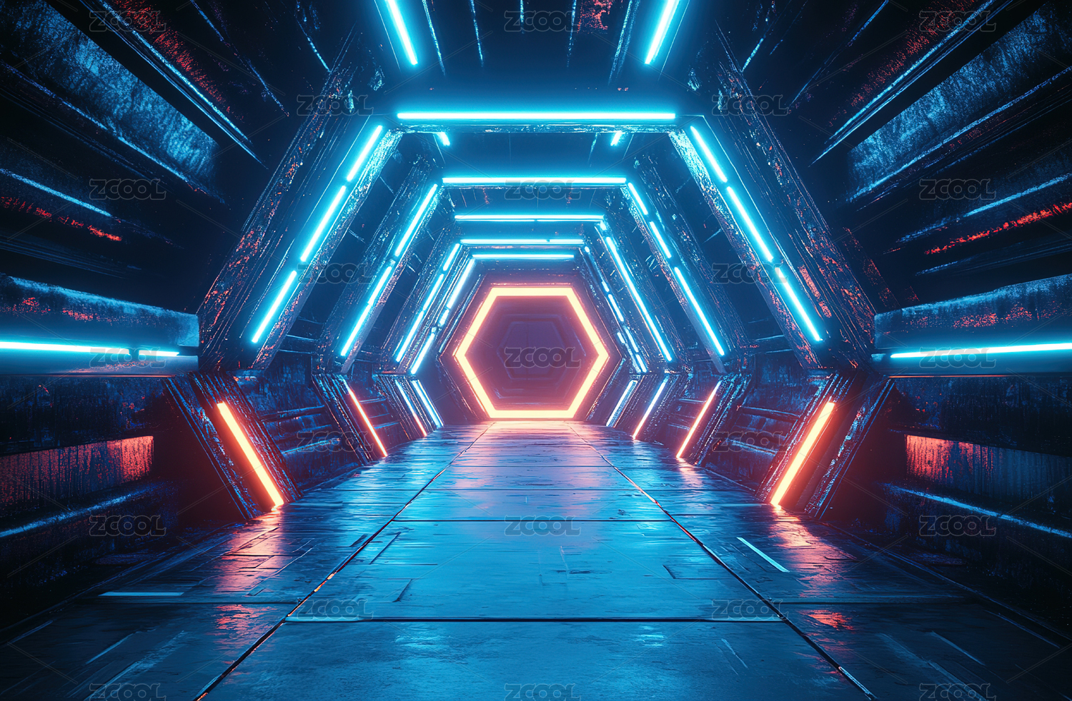 3D渲染科幻延伸空间站飞船走廊隧道背景