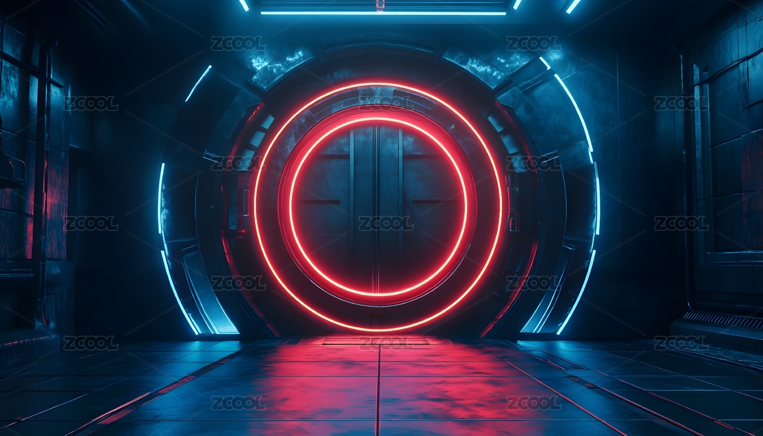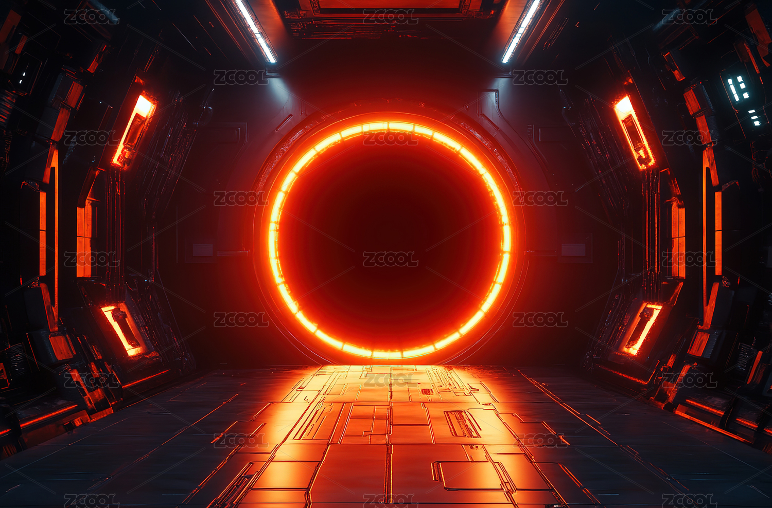 红色灯光照亮的未来科技走廊
