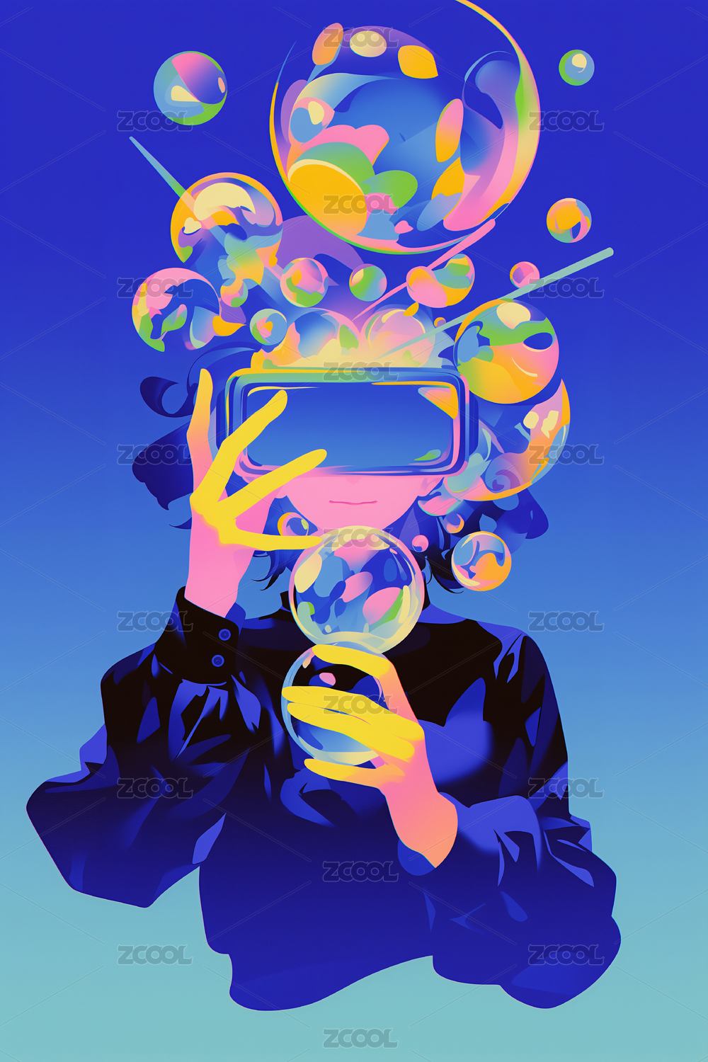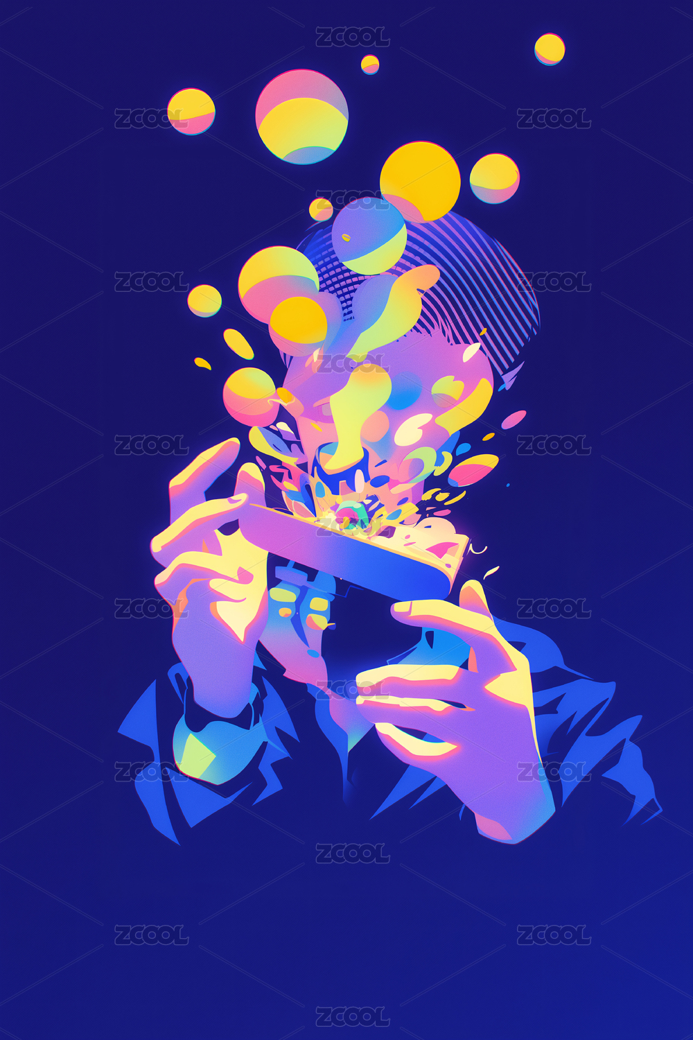 双手中间的炫彩色子圆球Y2K风格魔术插画