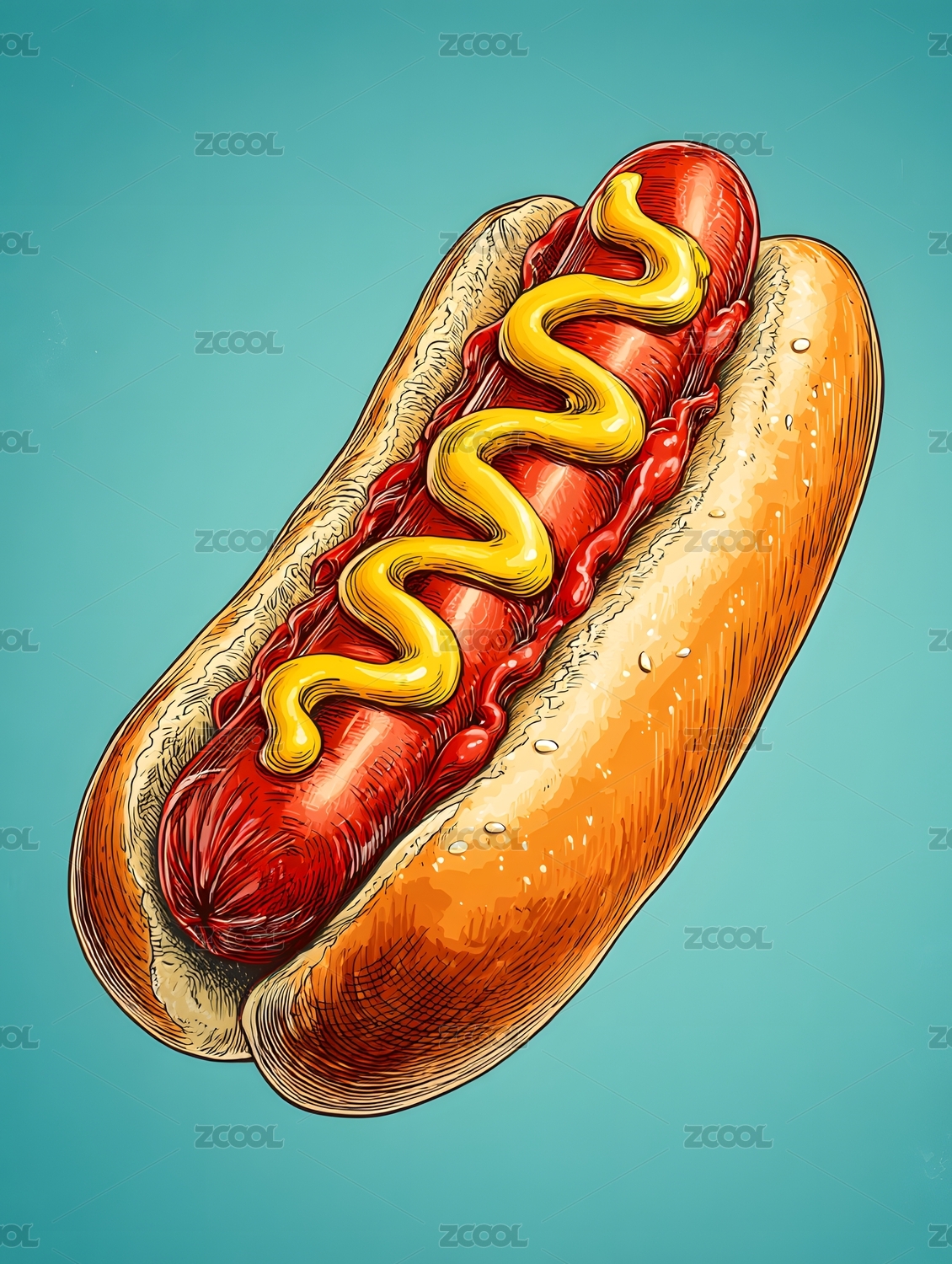 金黄色诱人美式快餐热狗3D卡通食品插画
