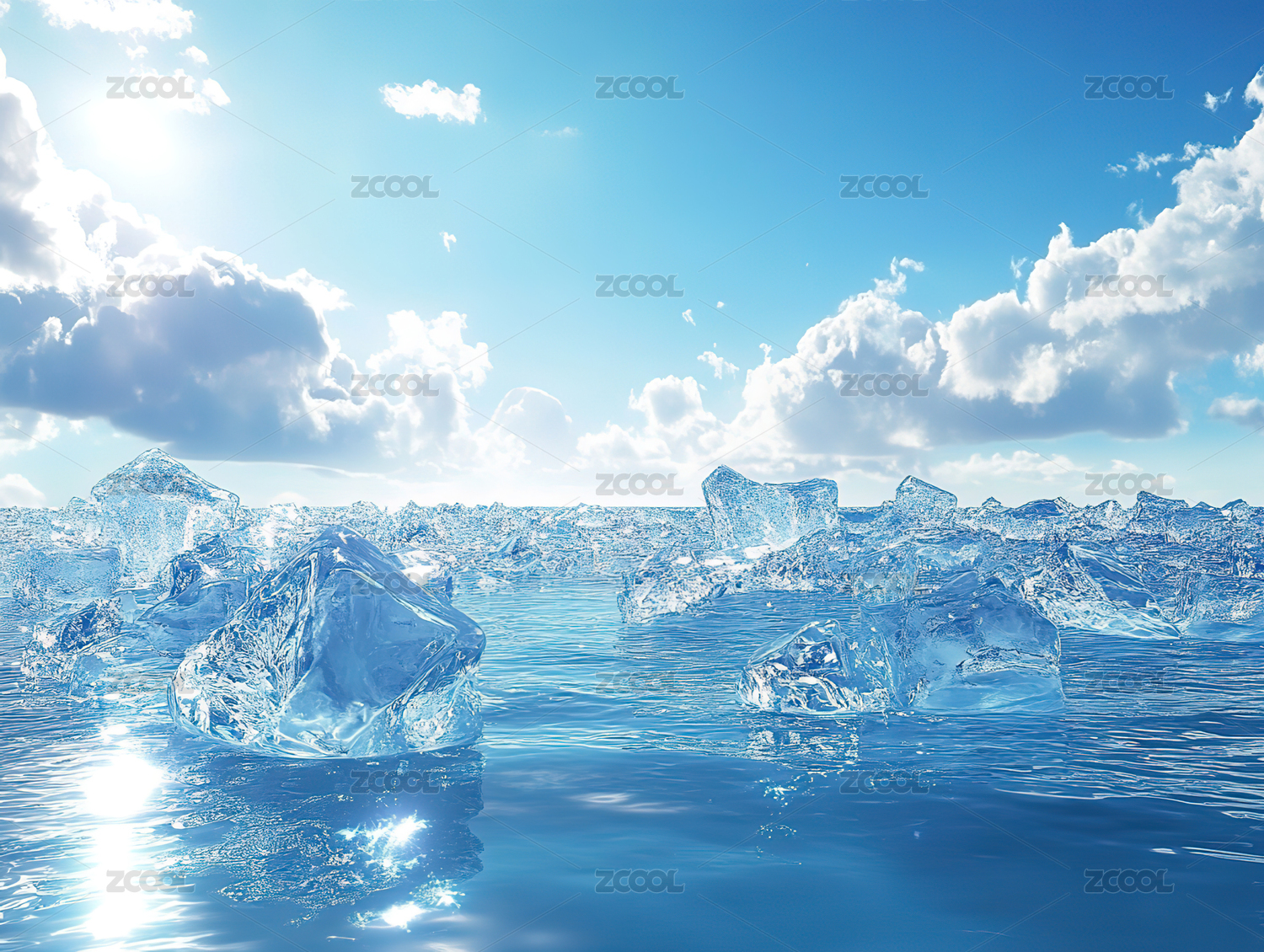 冰块漂浮在清澈湛蓝的海水中
