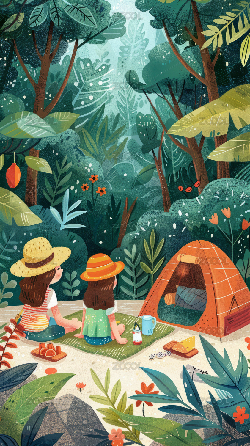 小伙伴们在野外休闲露营插画