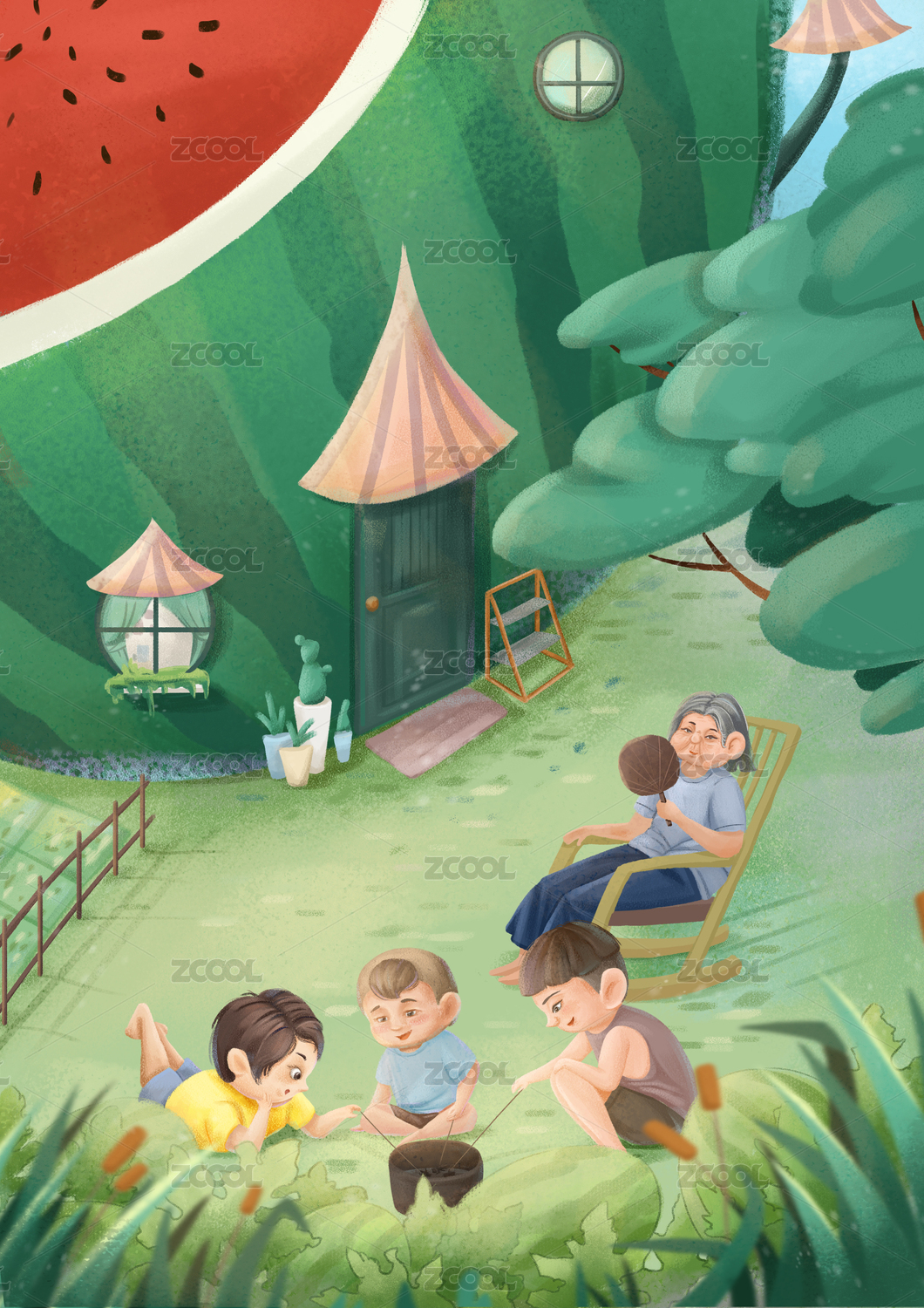 夏季家人吃西瓜矢量插画