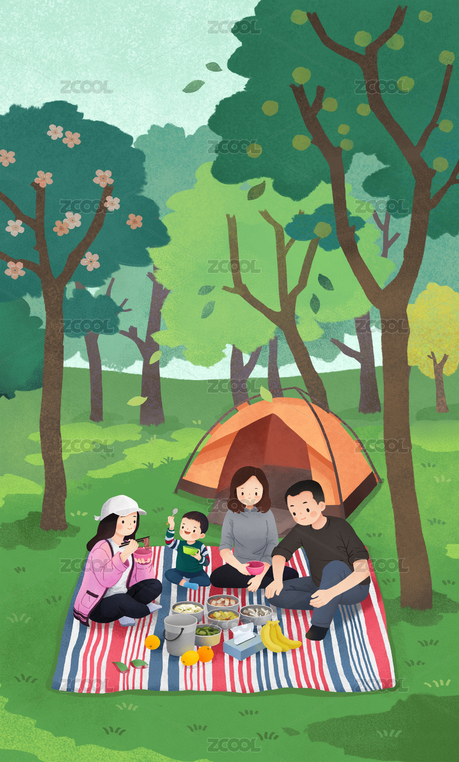 卡通插画风格家庭聚餐露营场景