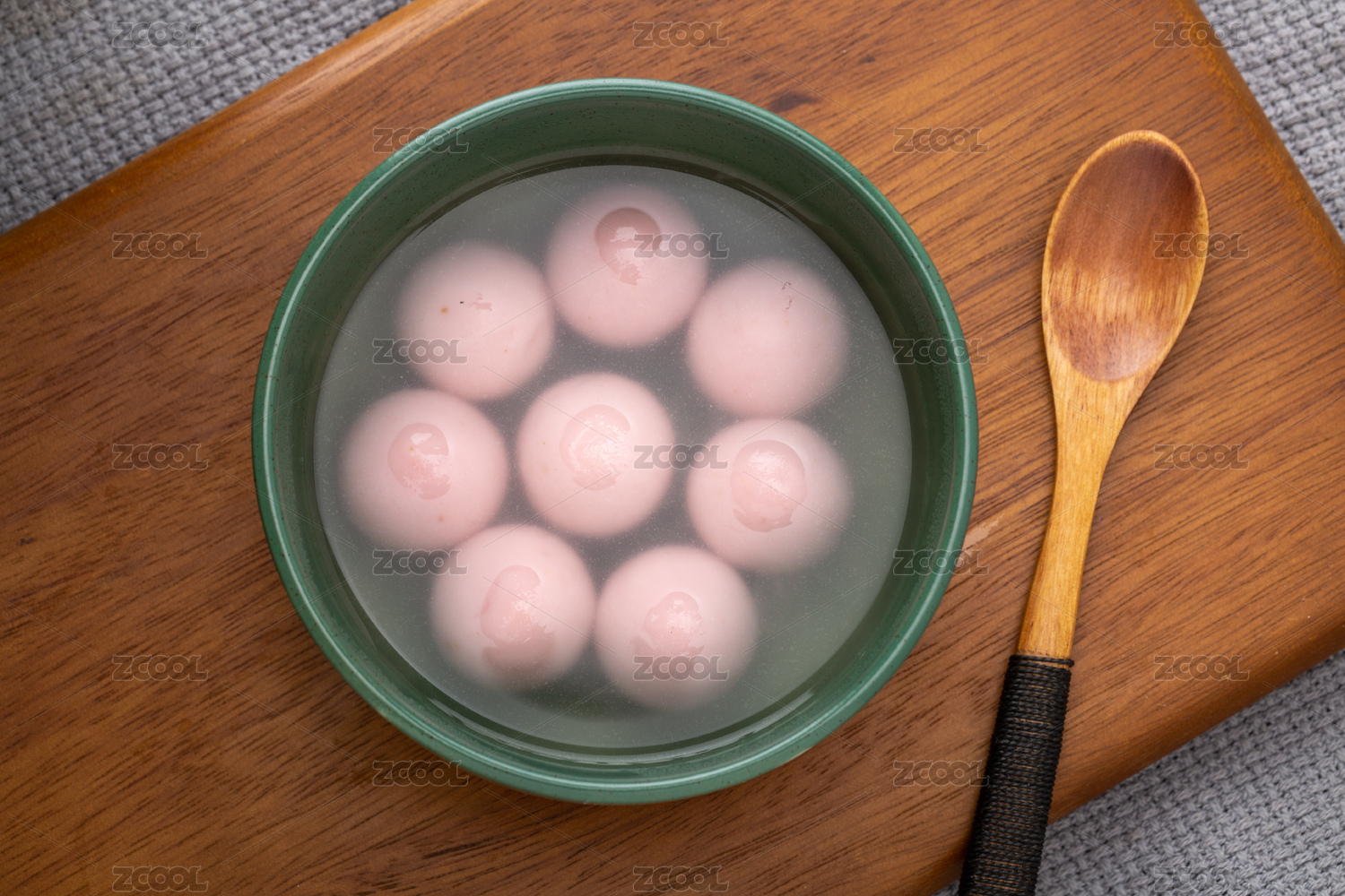 桌面上的玻璃碗里面的美味可口的紫薯汤圆