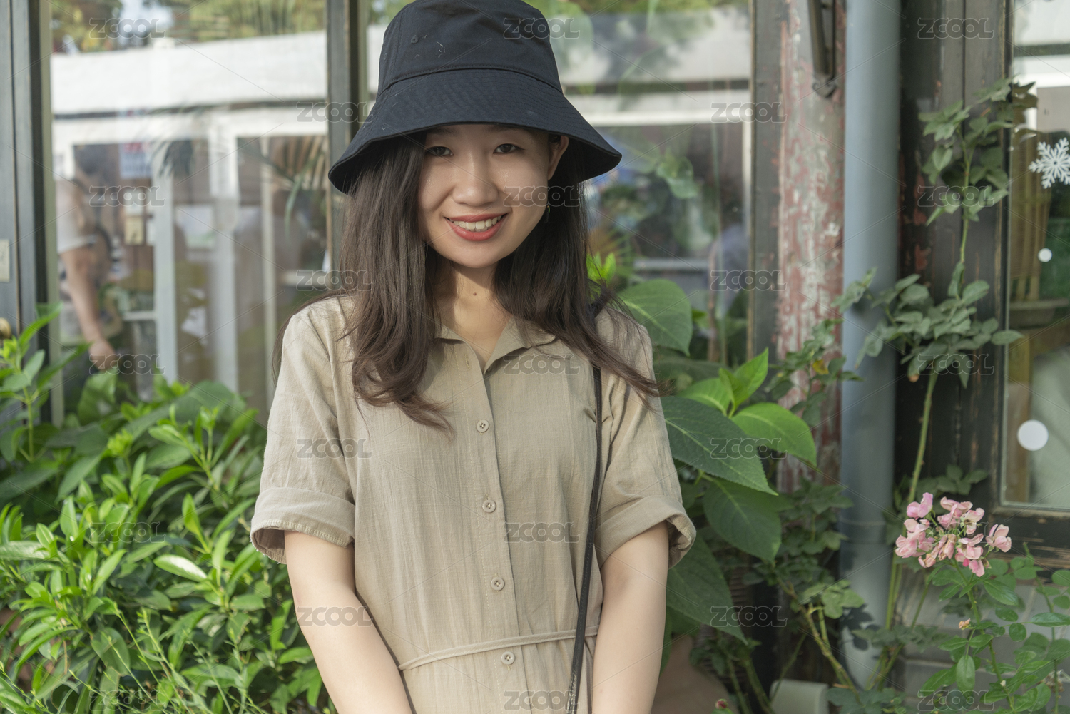 春天在北京798艺术区穿连衣裙的年轻女孩
