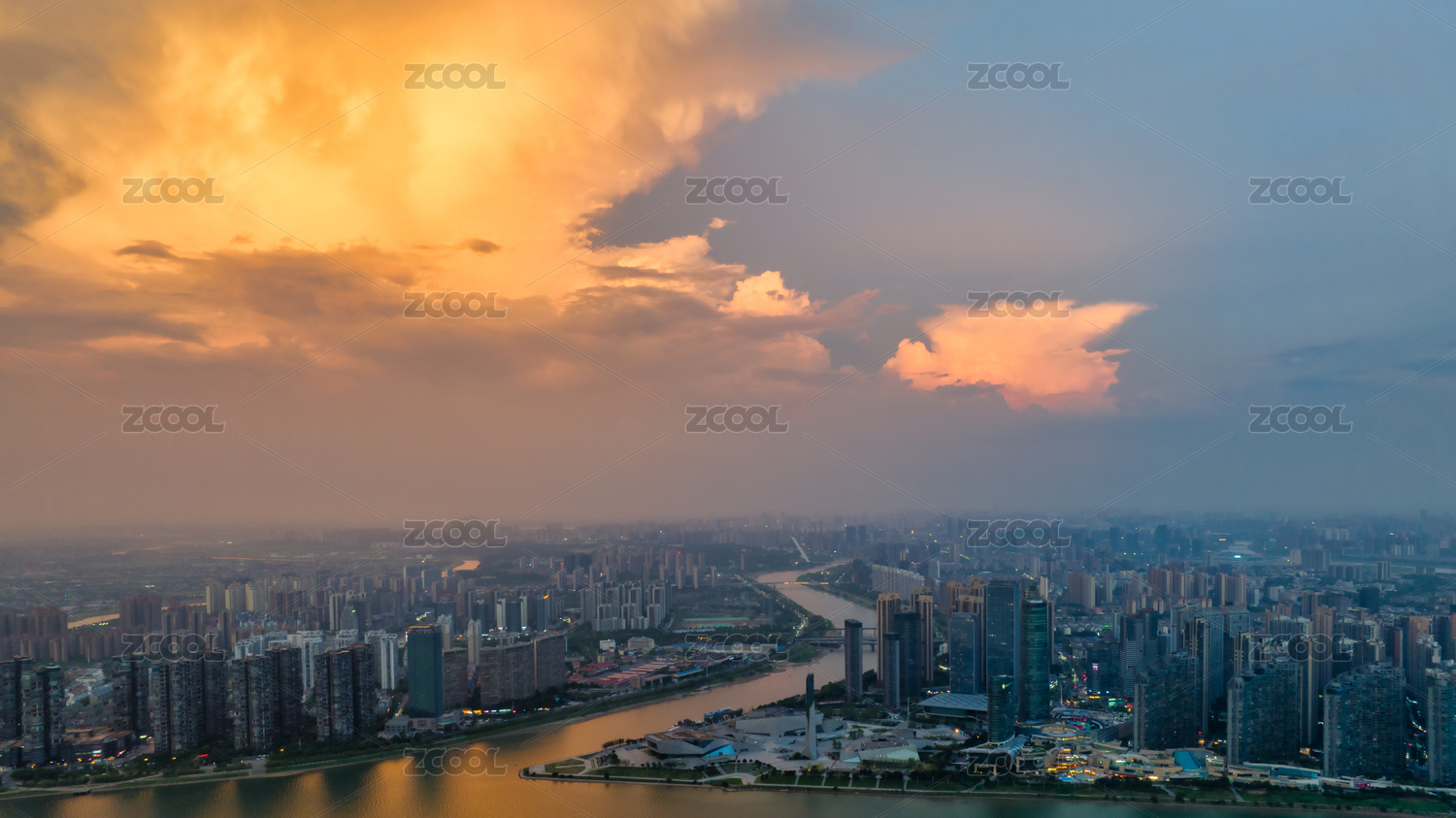 夕阳下的长沙CBD城区与湘江