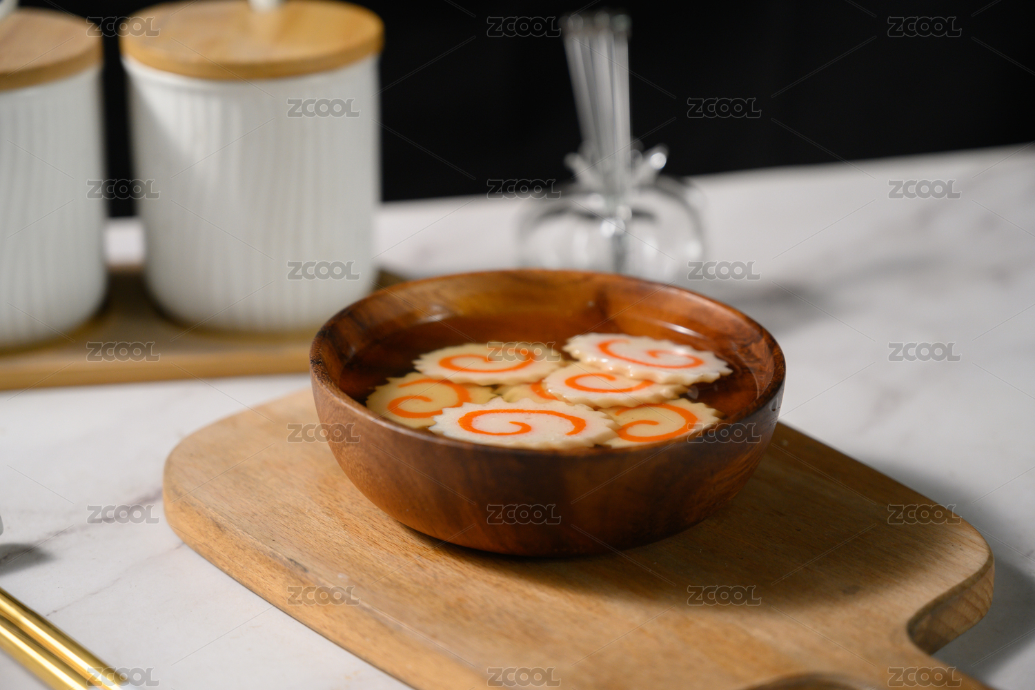 桌面上的碗里的美味可口的清汤鸣门卷