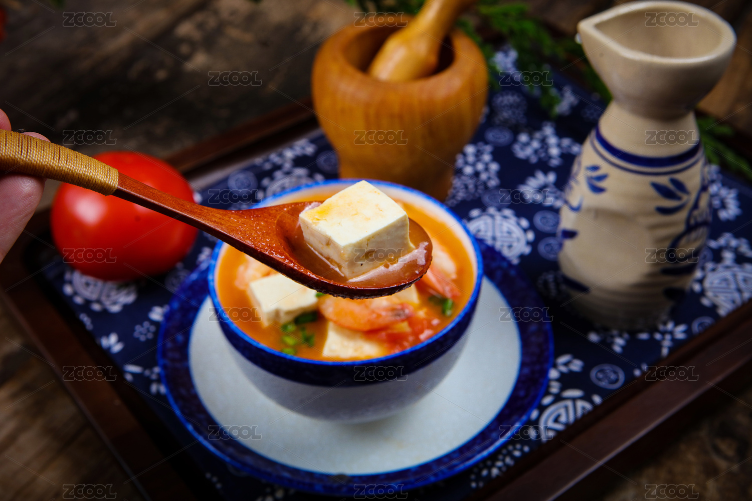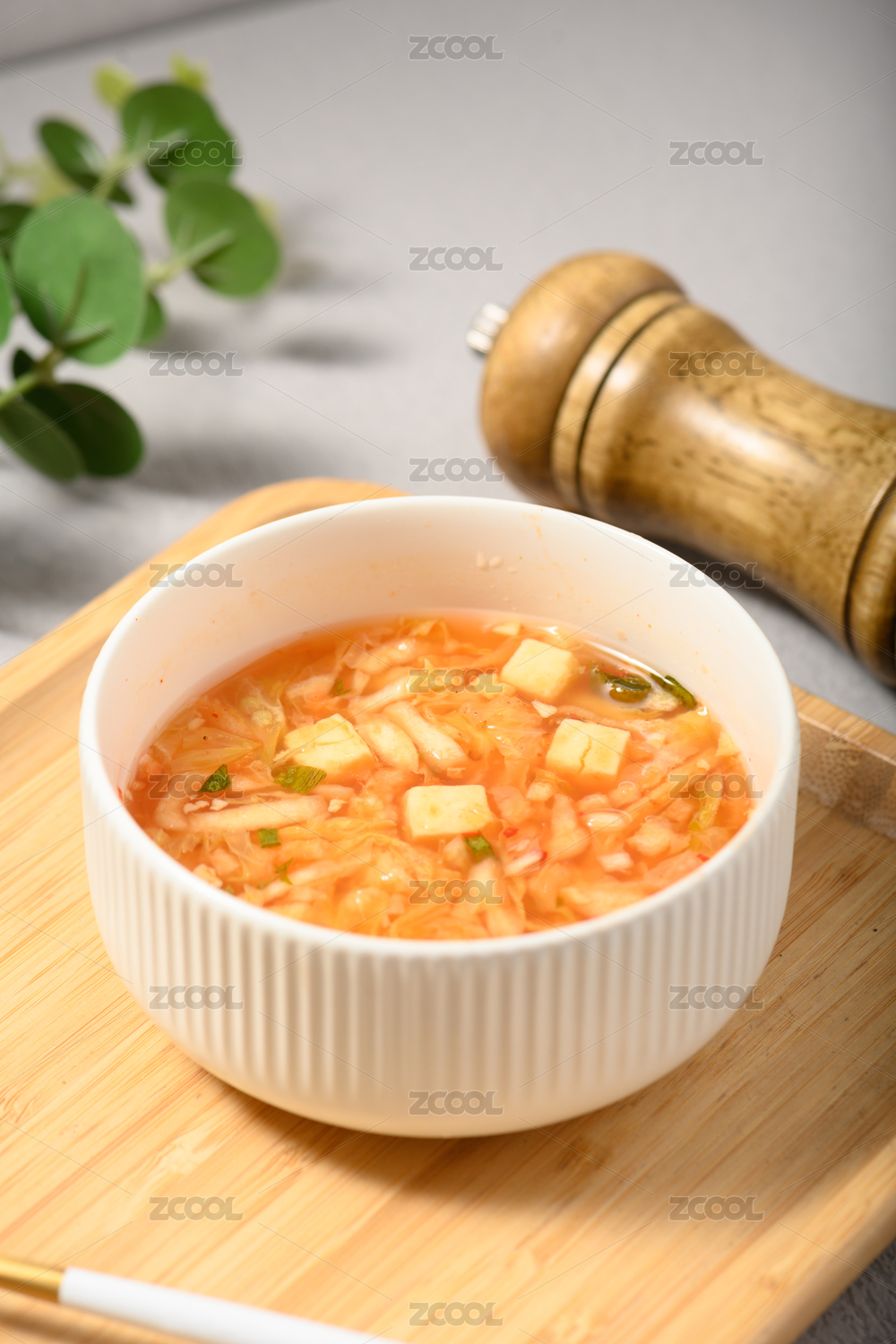 桌面上的碗里面的美味可口的泡菜豆腐汤