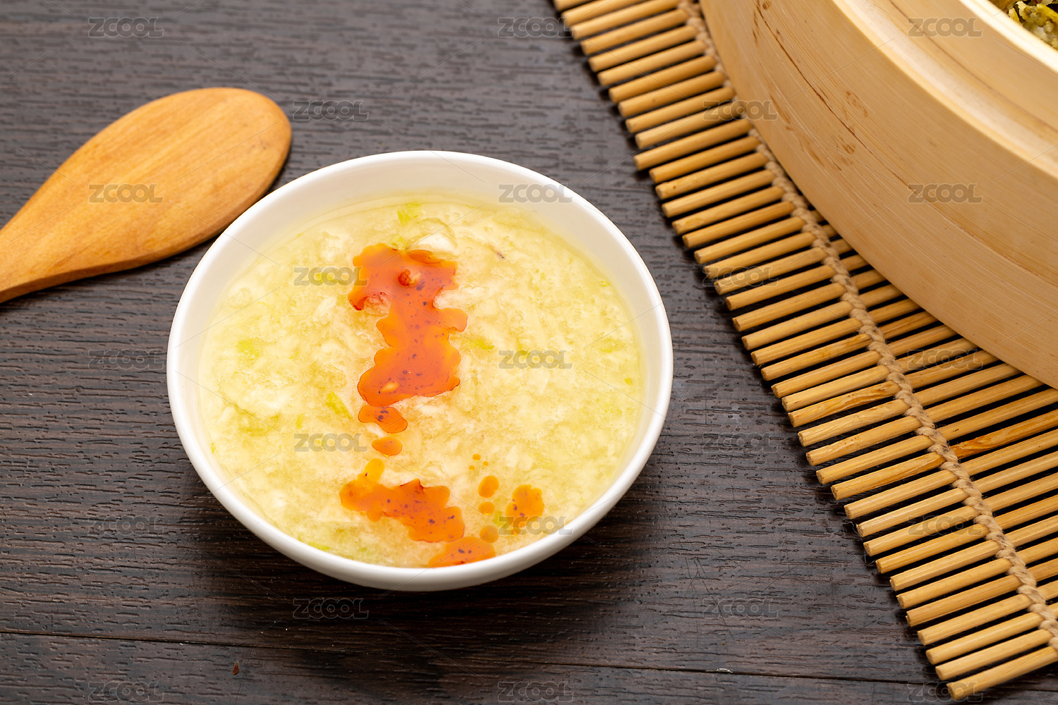 桌面上的盘子里的美味可口的西红柿蛋花汤