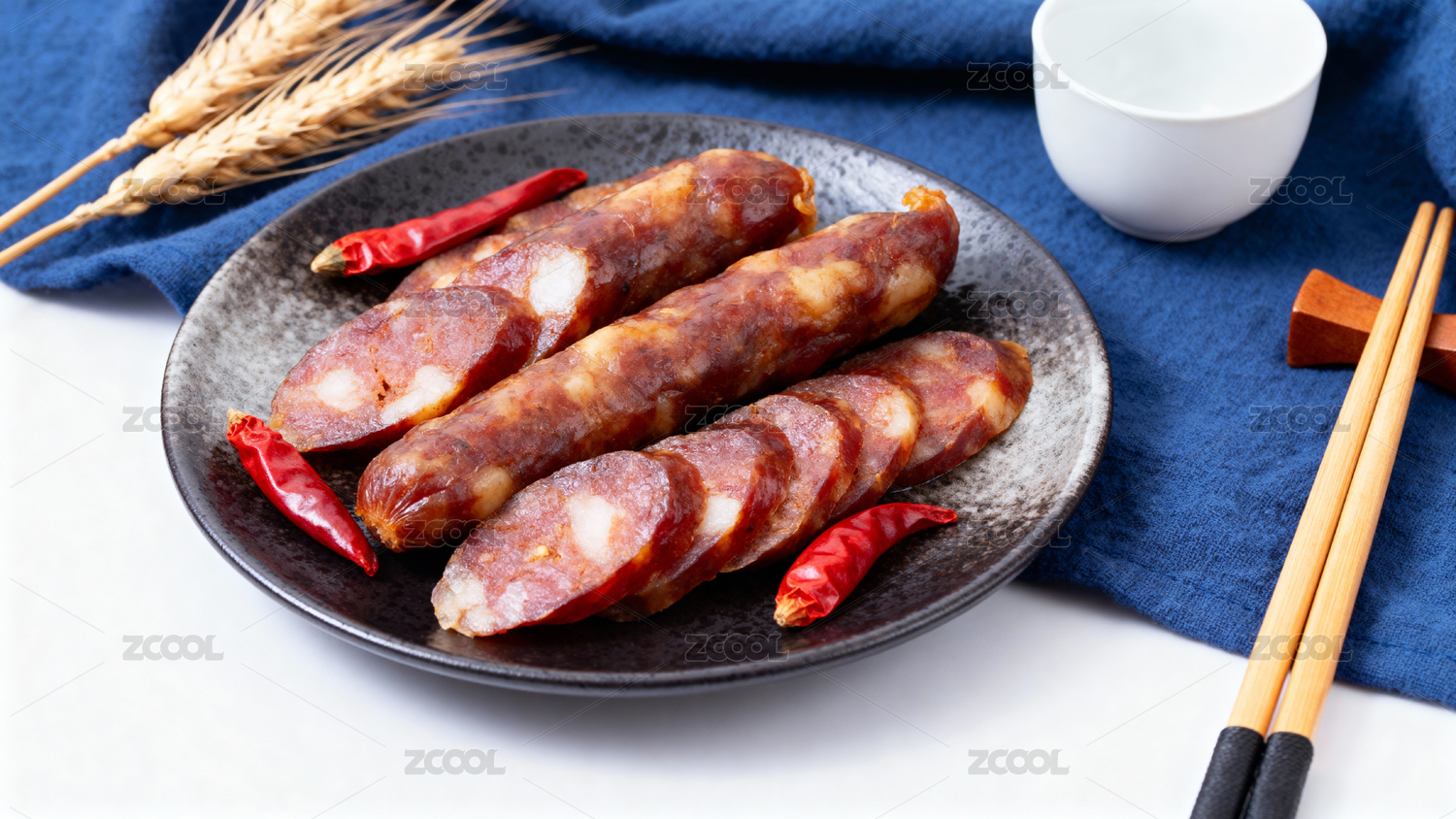 蓝布餐垫上的腊肠与麦穗