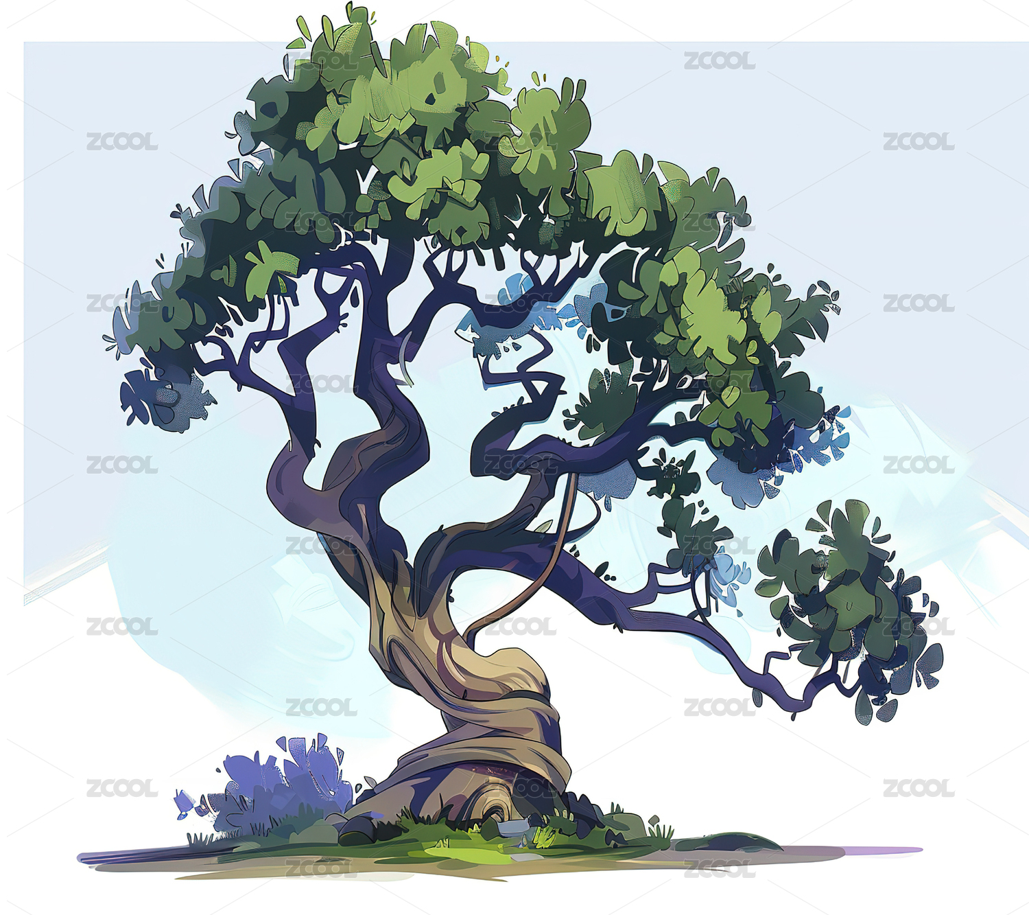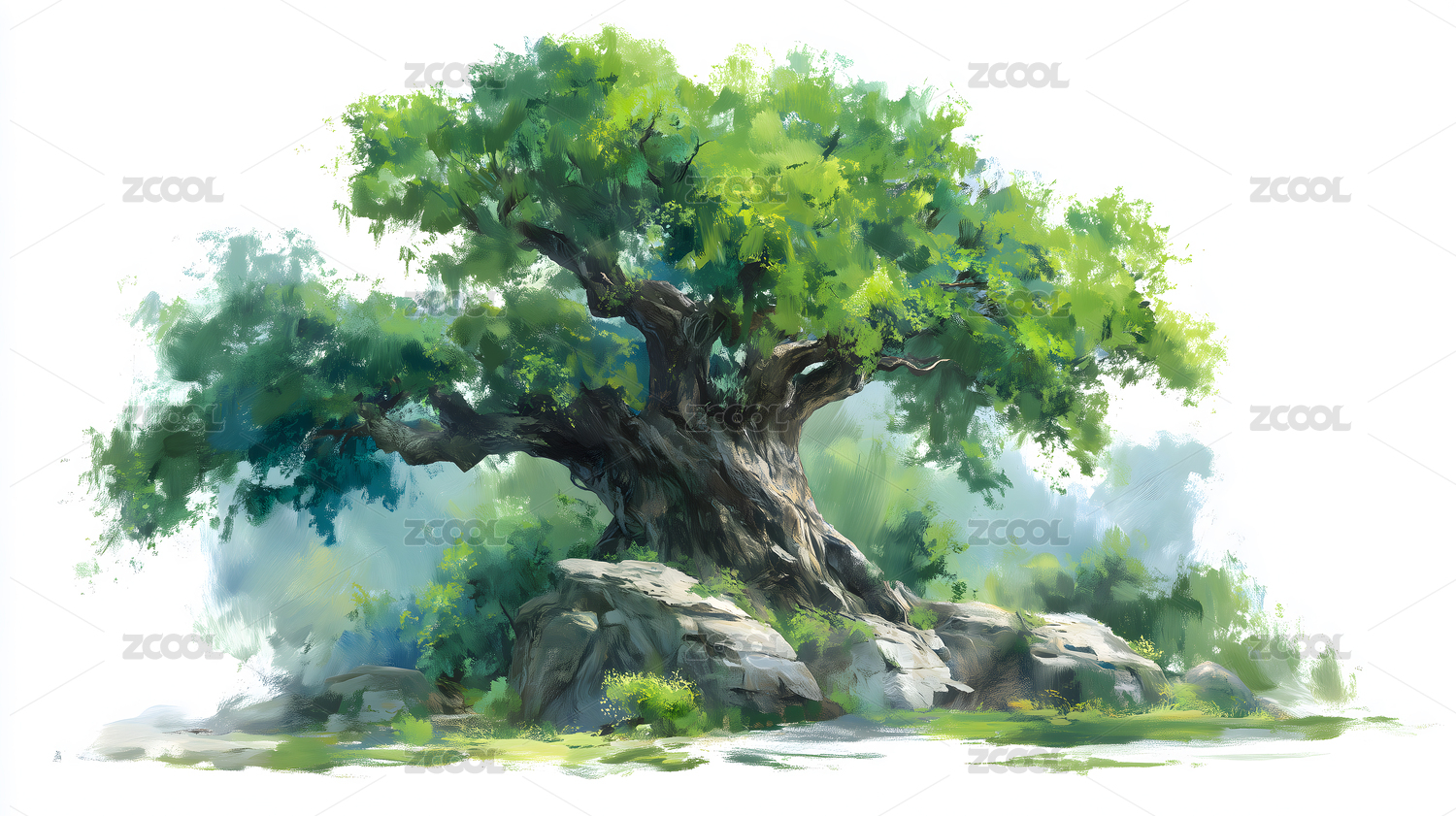 水彩风格老树风景画树木枝繁叶茂充满生机