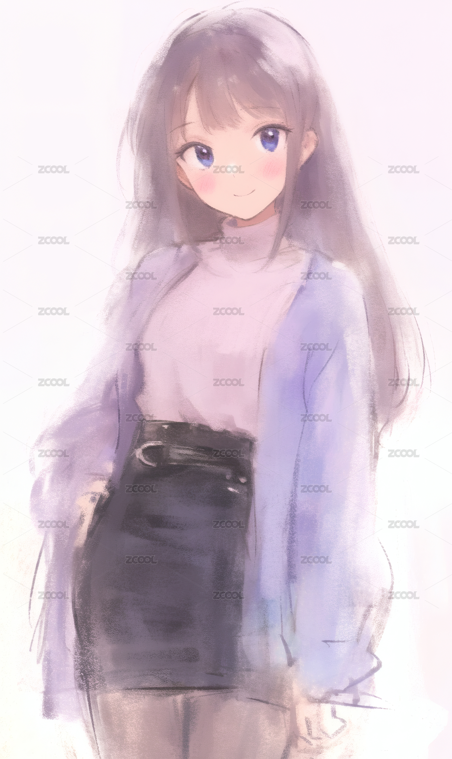 穿着裙子和毛衣的动漫女孩双手插在口袋里站