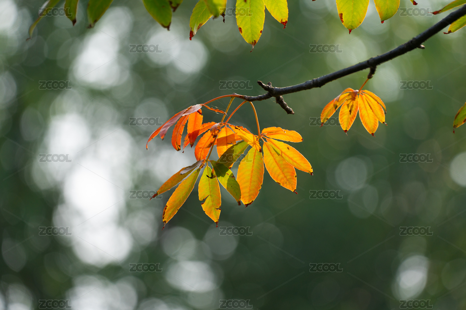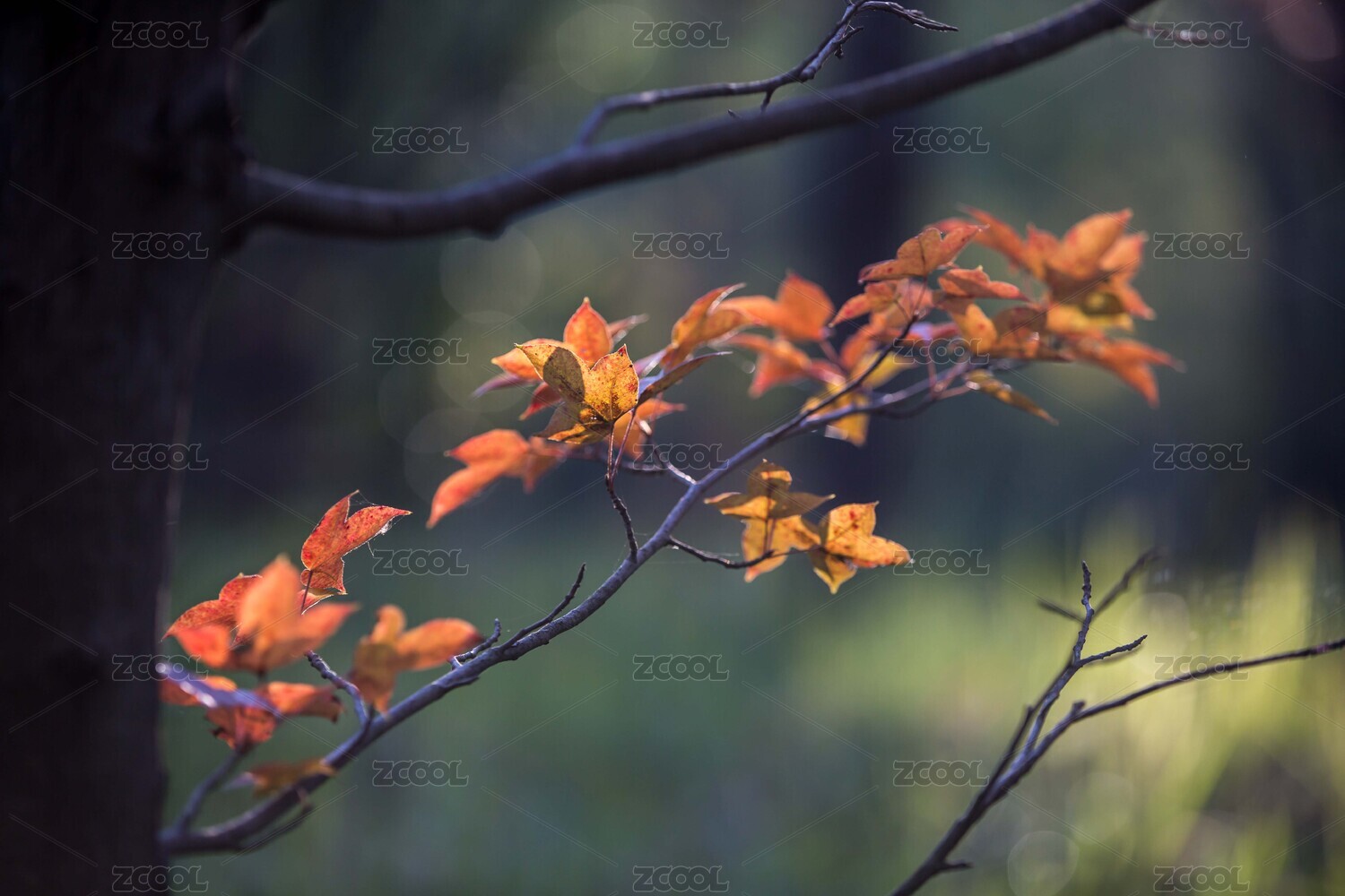 深秋逆光照耀下晶莹剔透的红色枫叶