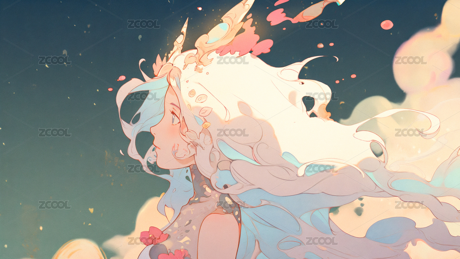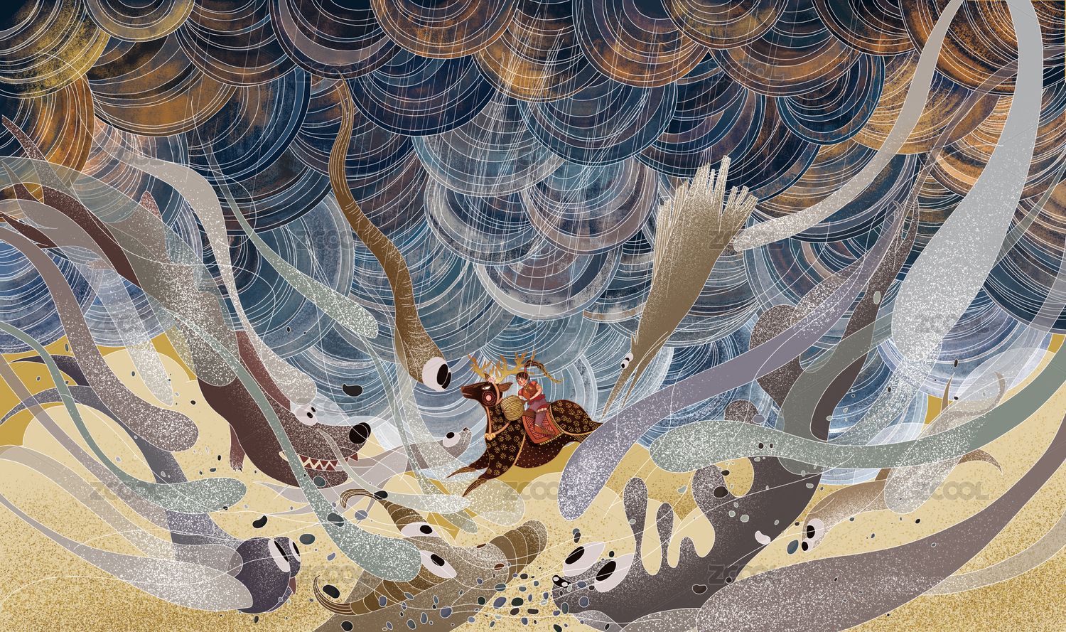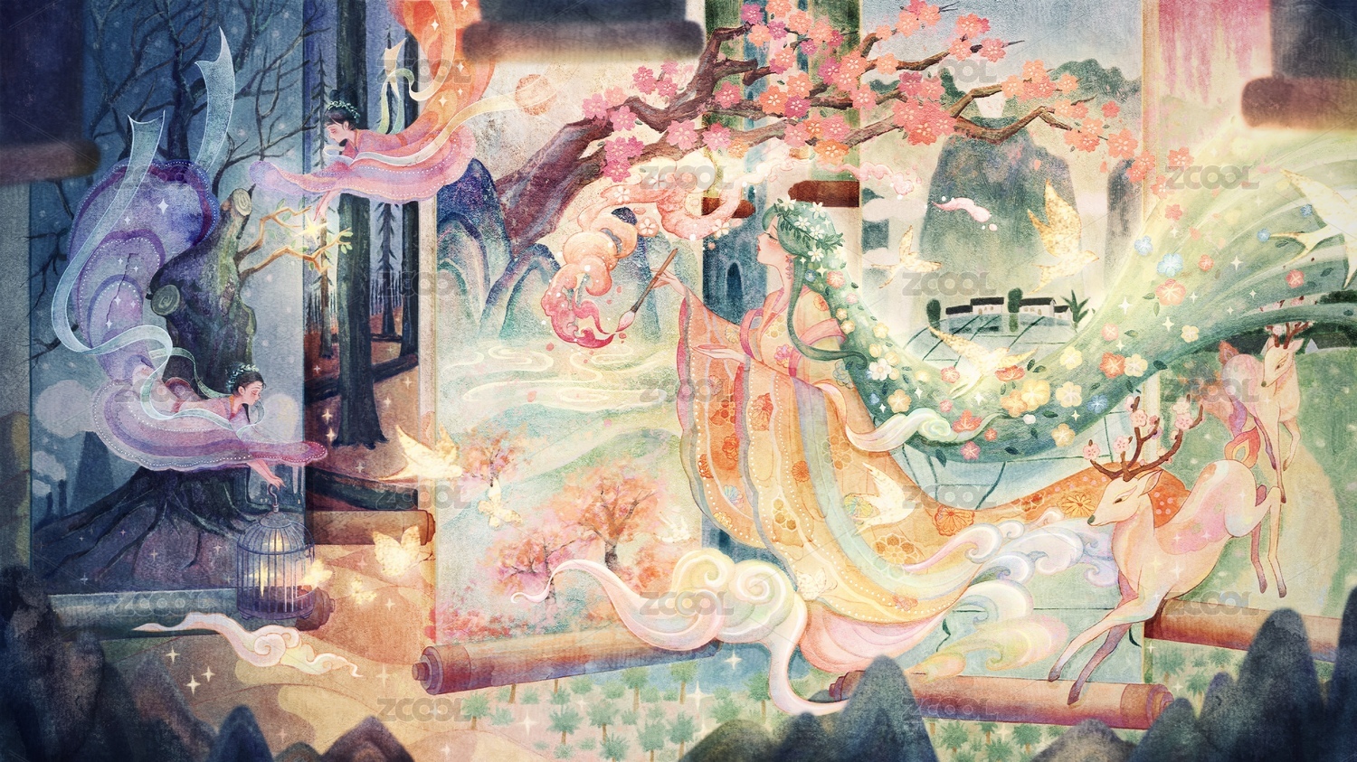 时空麋鹿在充满梦幻云彩泡泡的山涧里嬉戏