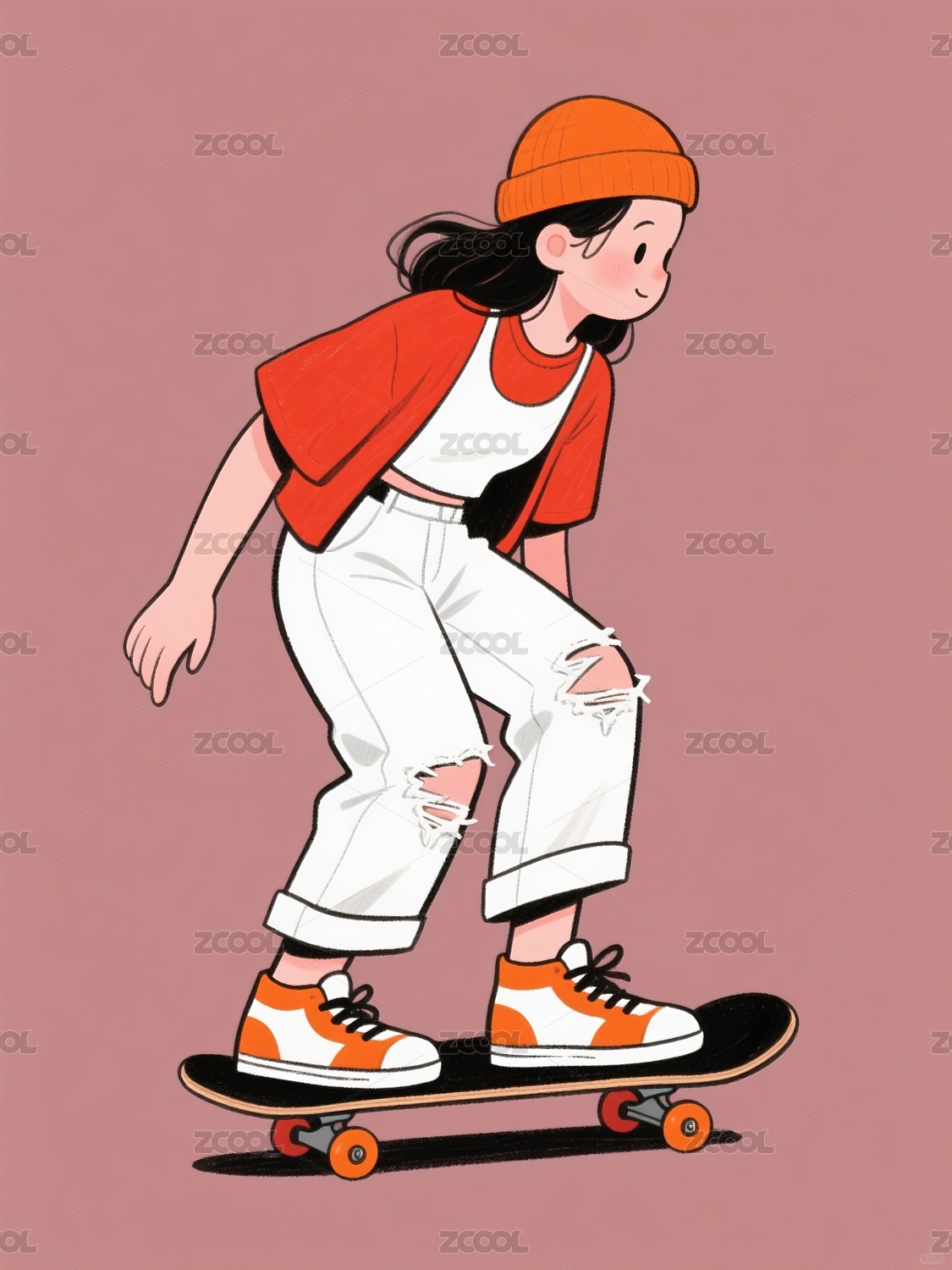 滑板,运动,少女,涂鸦风,可爱,简笔画