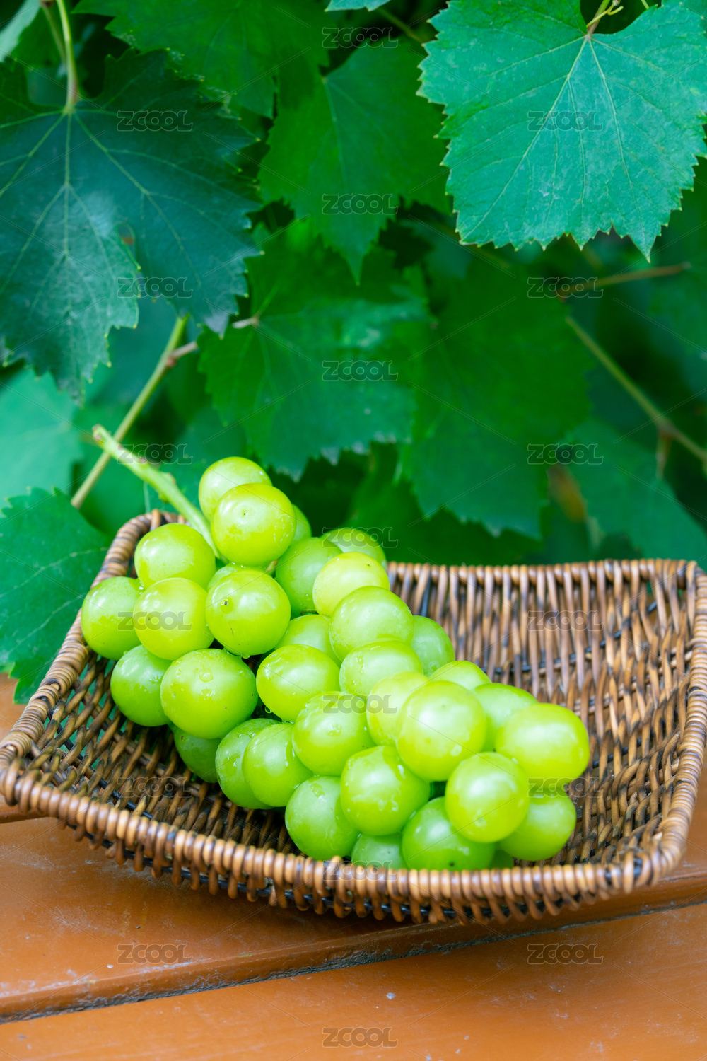 浅灰色的背景中多串绿色葡萄放在水果篮子里
