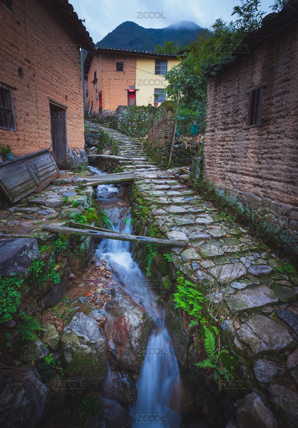 慢门下的小溪流水及岸边的老宅,福建上杭