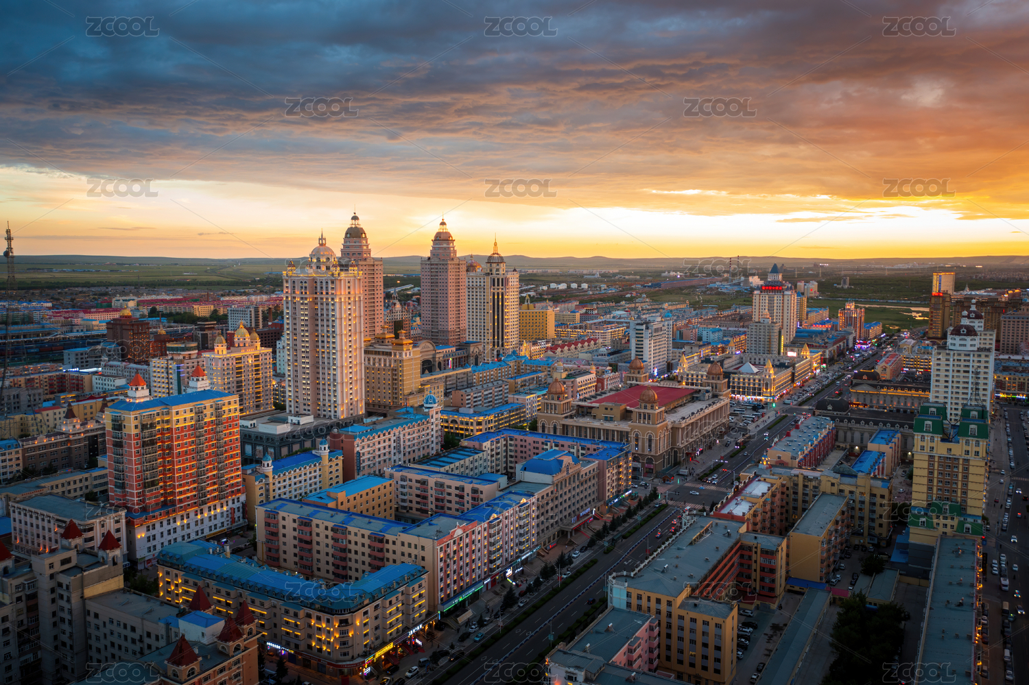 中国内蒙古呼伦贝尔市满洲里城市日落景观