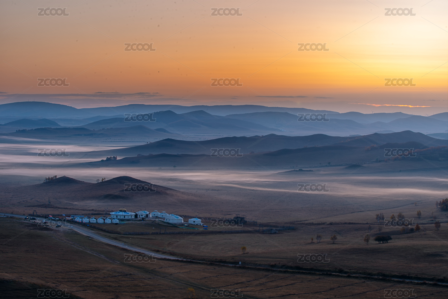 乌兰布统,晨雾,平流雾,雾,早晨,日出,山,树,群山,秋季