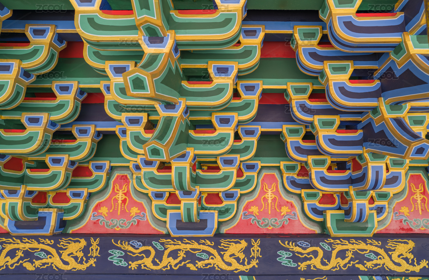 中国传统古建筑九踩斗拱及彩绘纹理图案特写