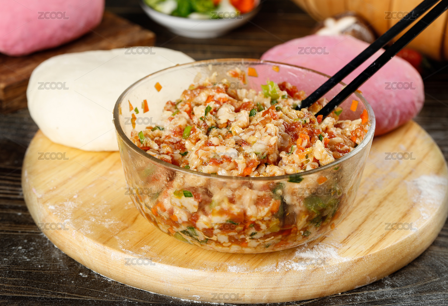 木板上放着一碗饺子鲜肉馅和筷子夹着肉馅