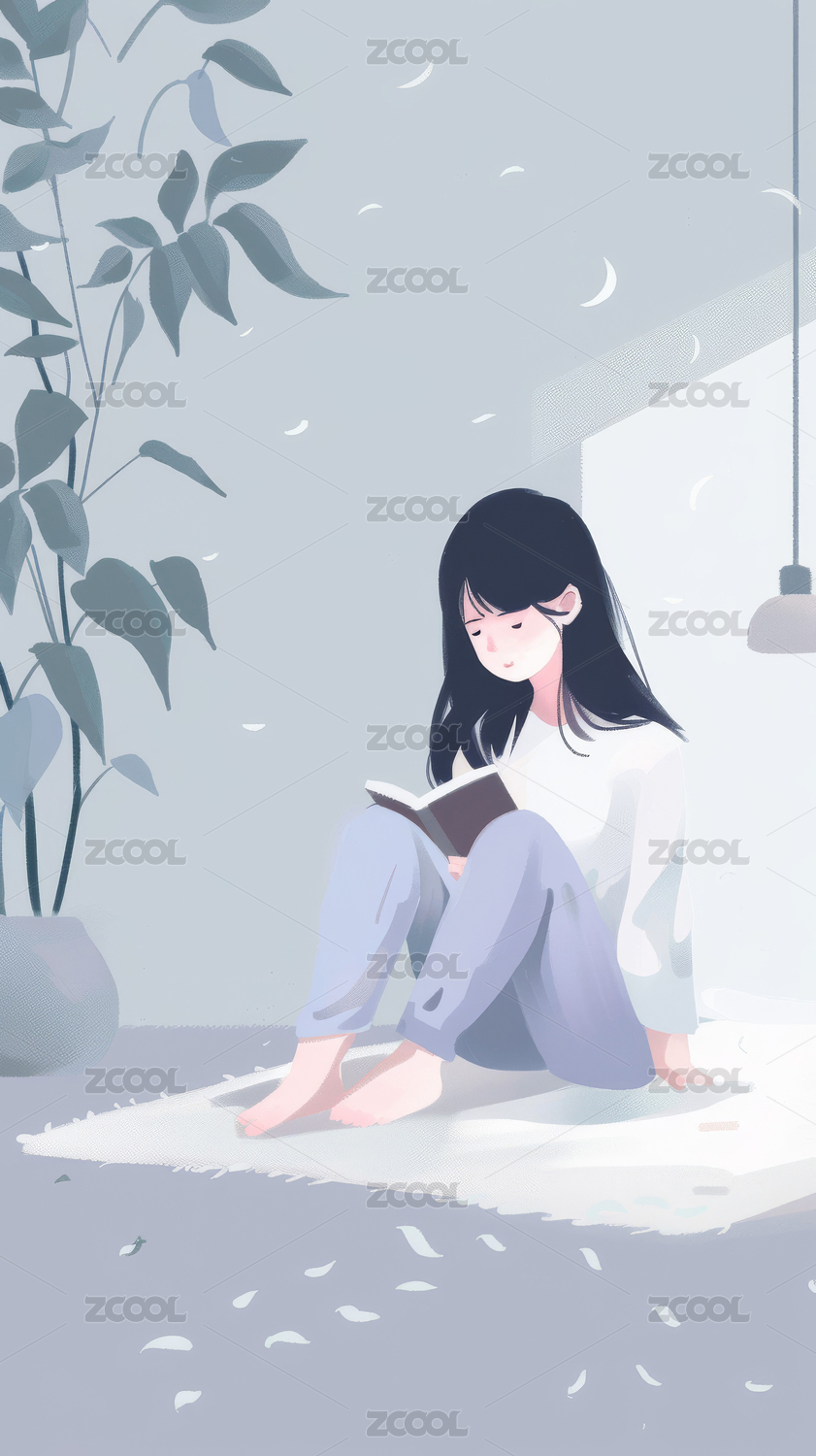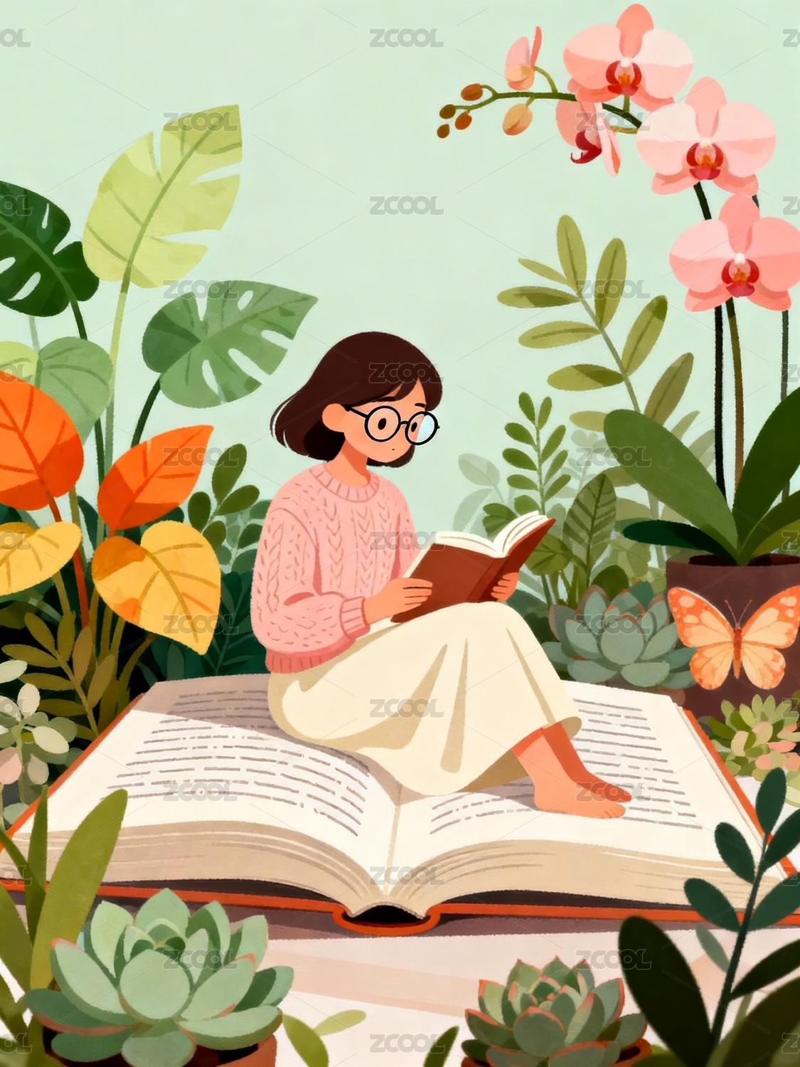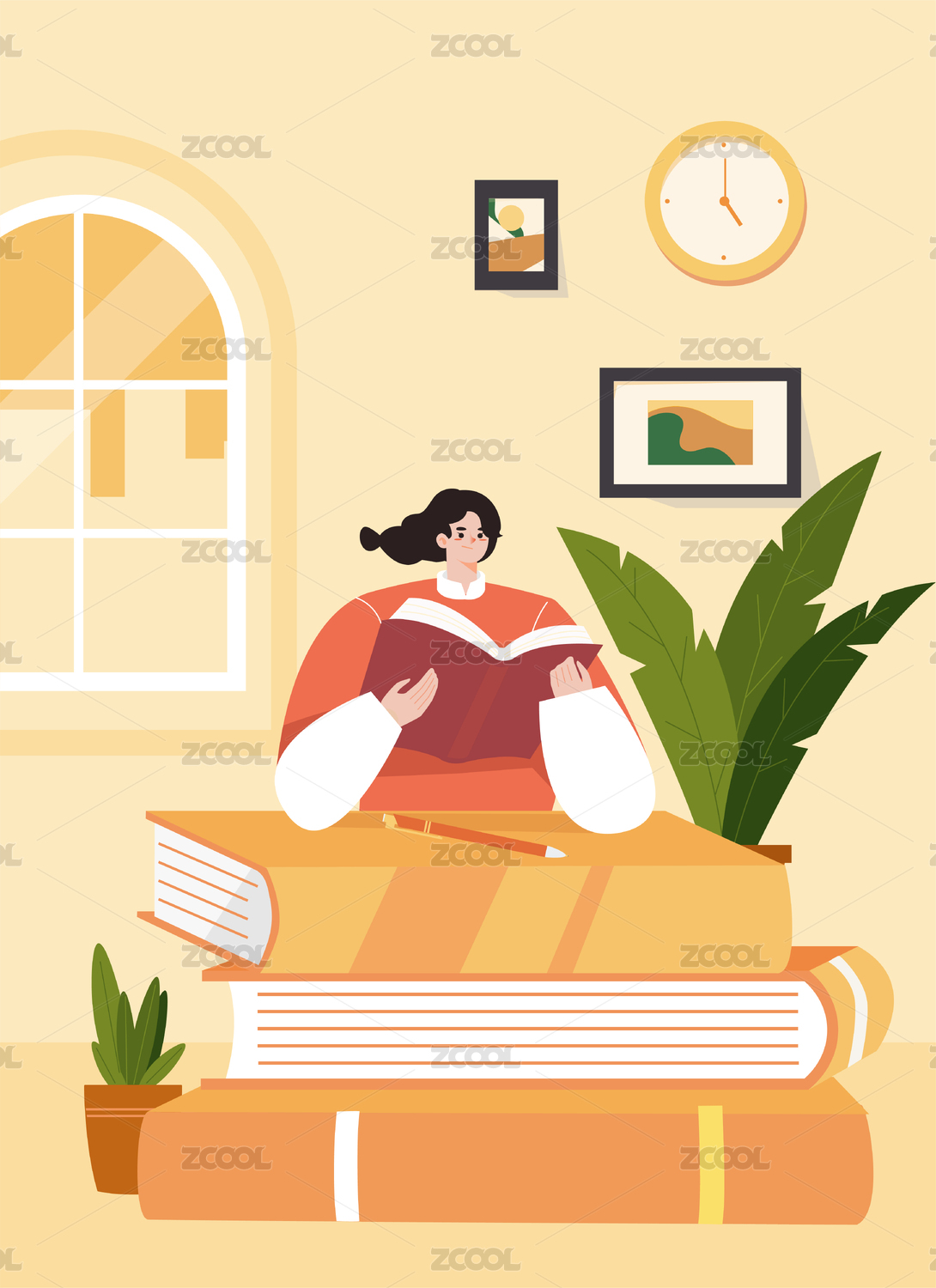 扁平,插画,女孩,梦幻,书籍,阅读,图书馆,看书,读书,花