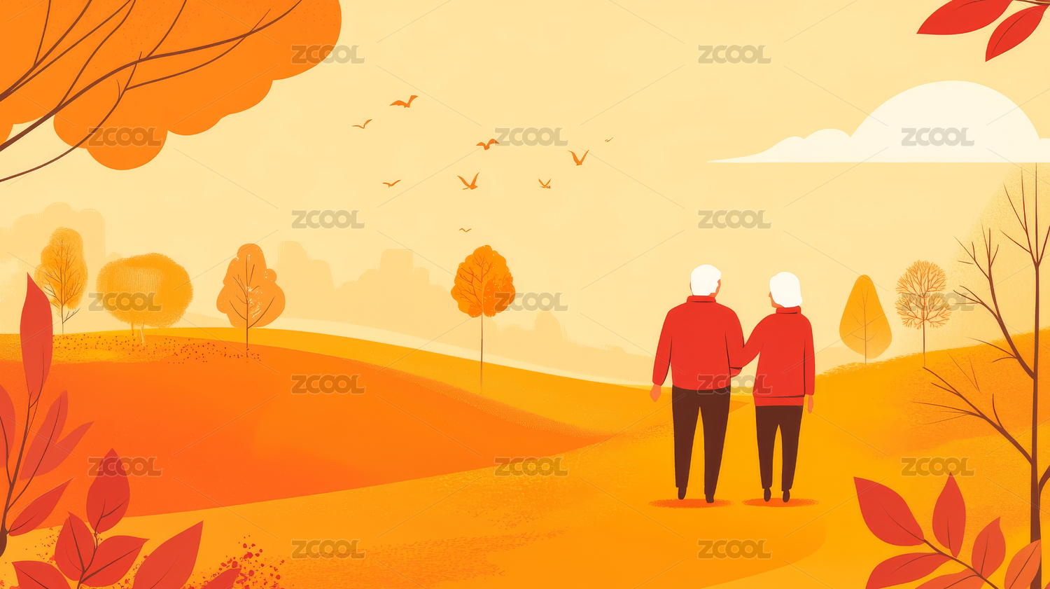 AIGC202406,户外,菊花,重阳节,陪伴,恩爱,老年人,插画,海报,背景
