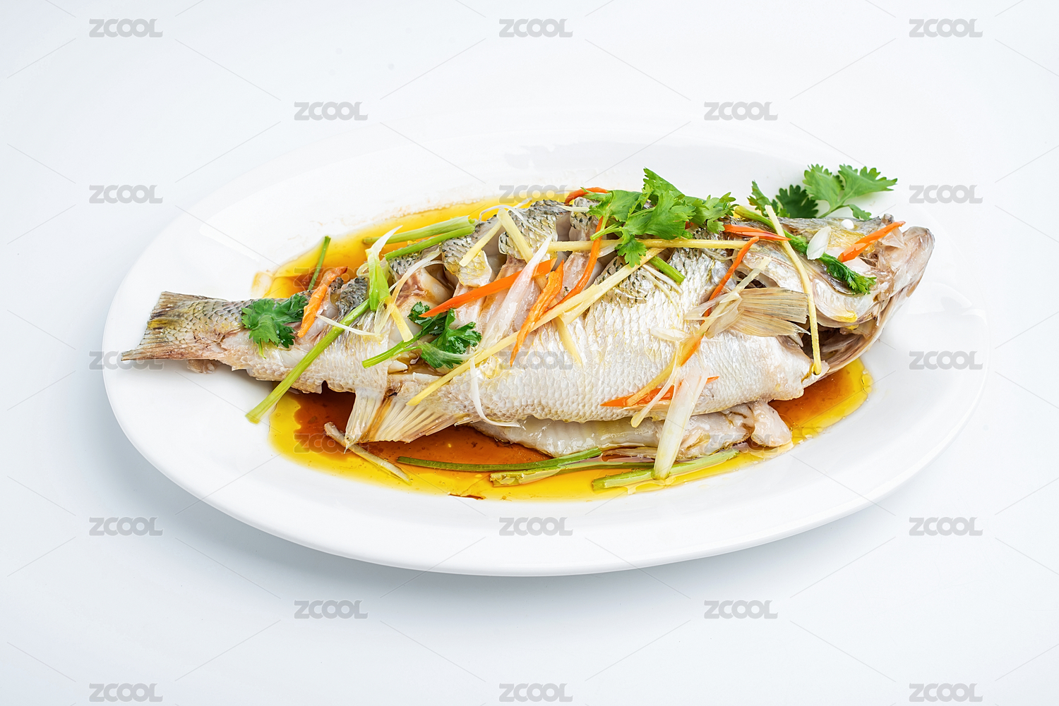 中国粤菜一碟清蒸鲈鱼在白背景上