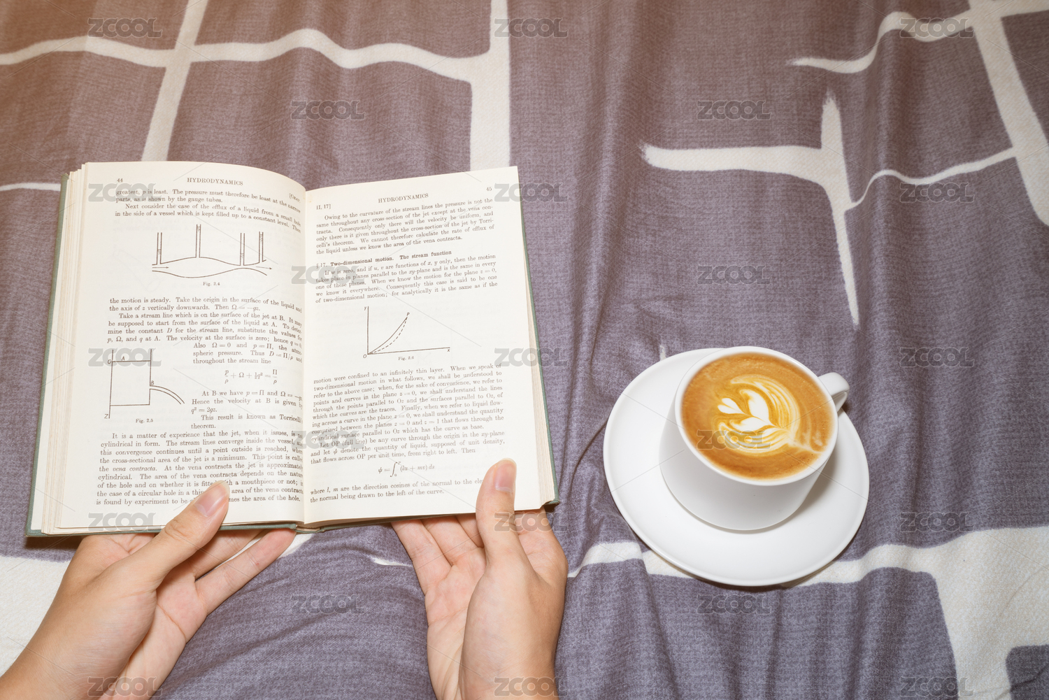 一个人在温暖的被子上看书学习放松喝咖啡喝奶茶
