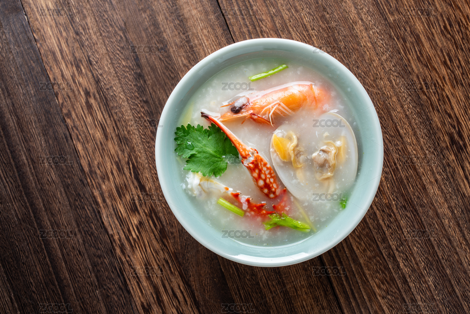 中国美味海鲜粥,厨房台面上一碗虾蟹粥