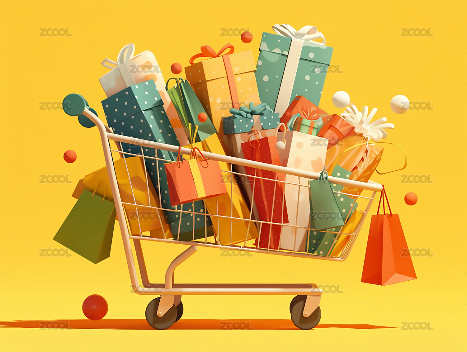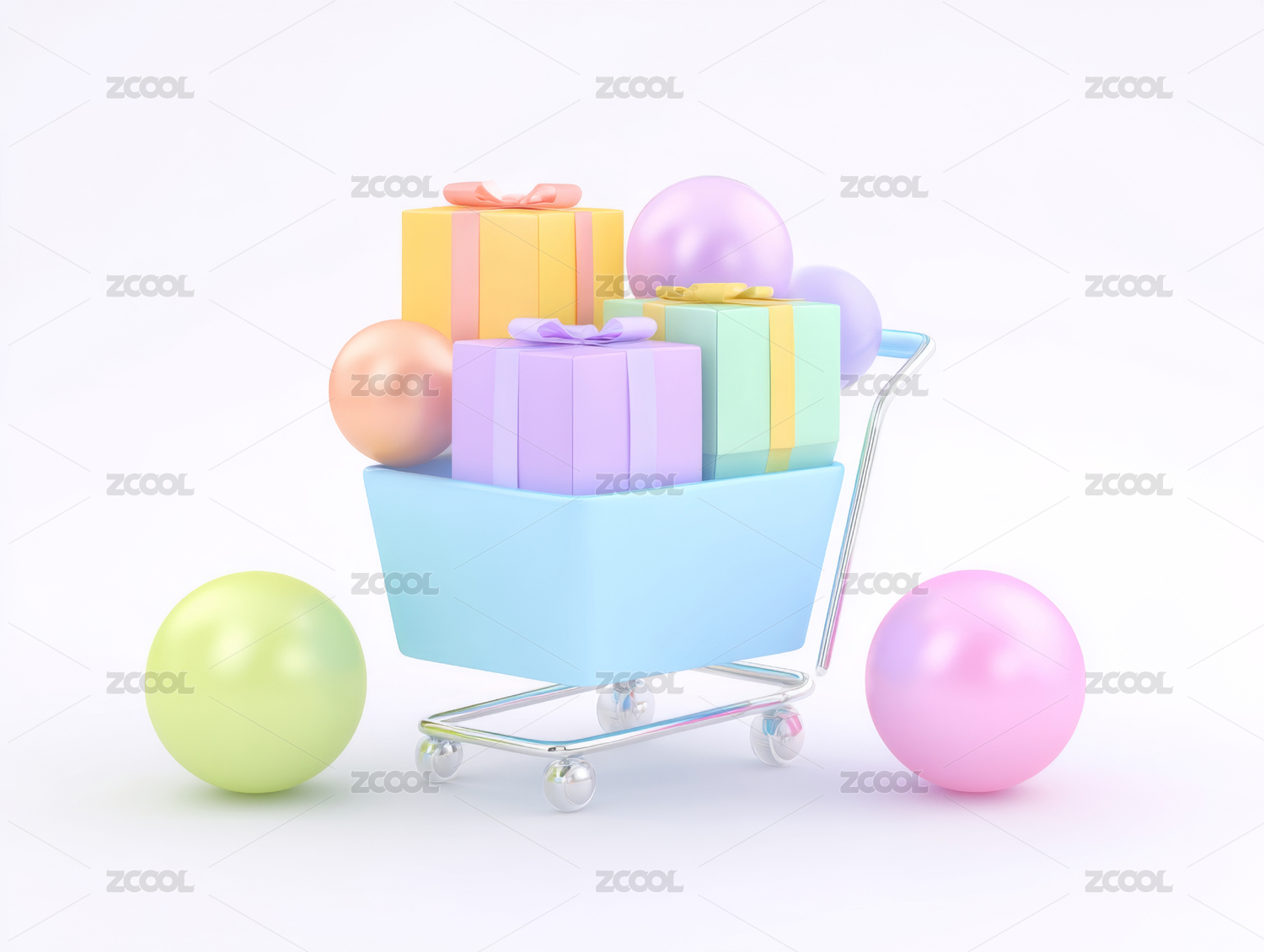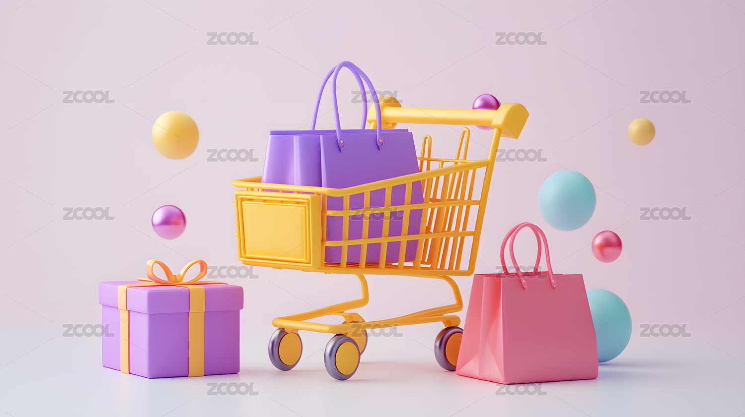 卡通购物车购物袋3D渲染