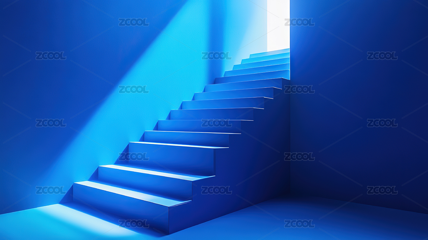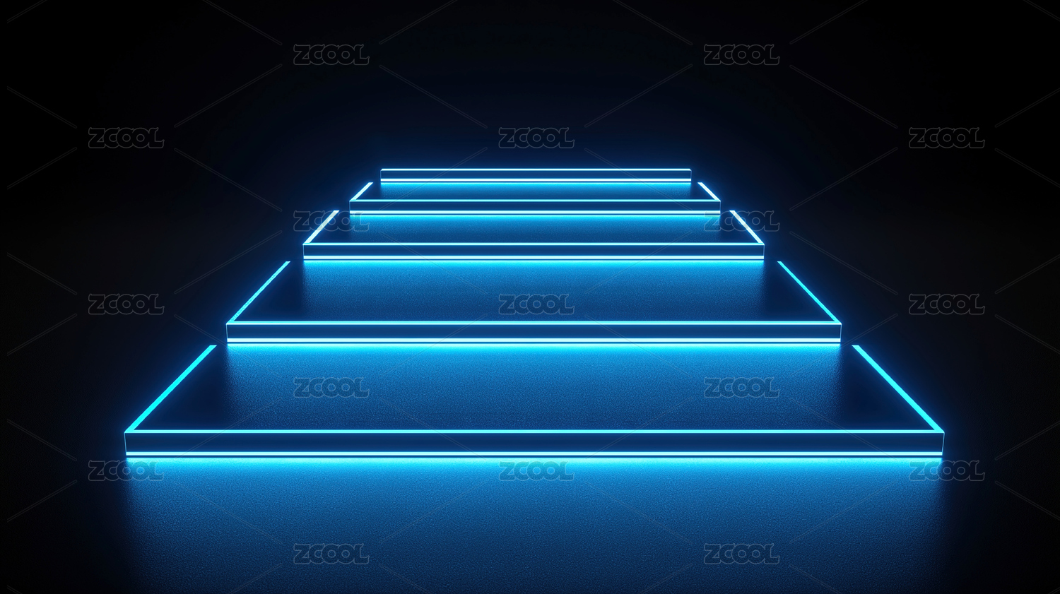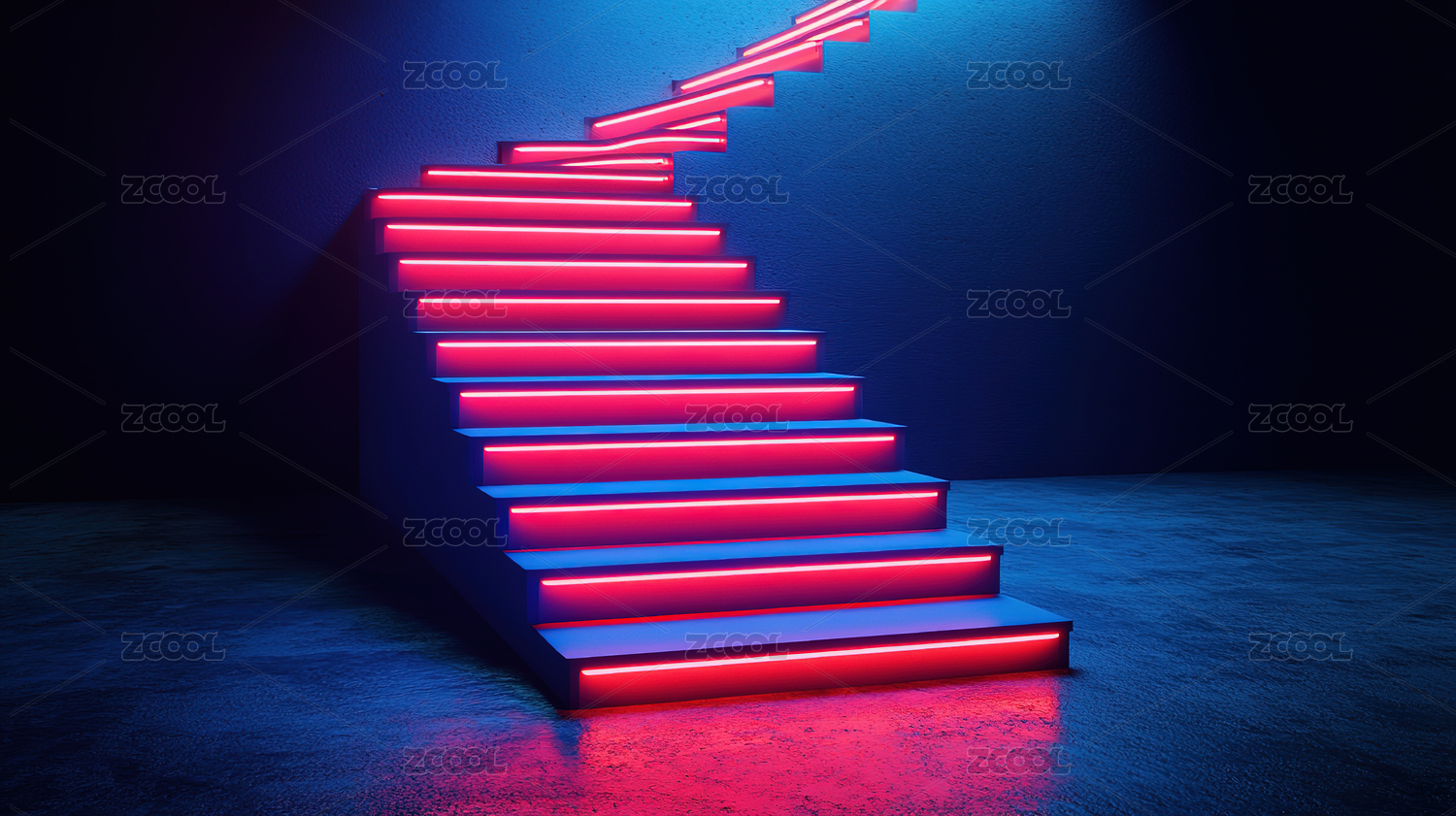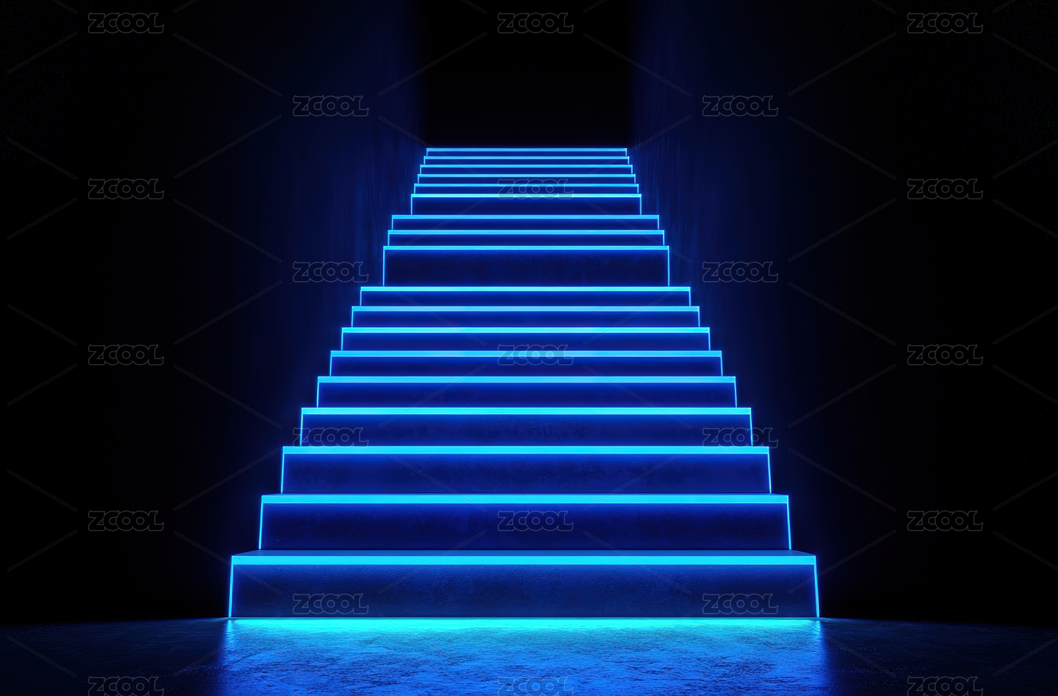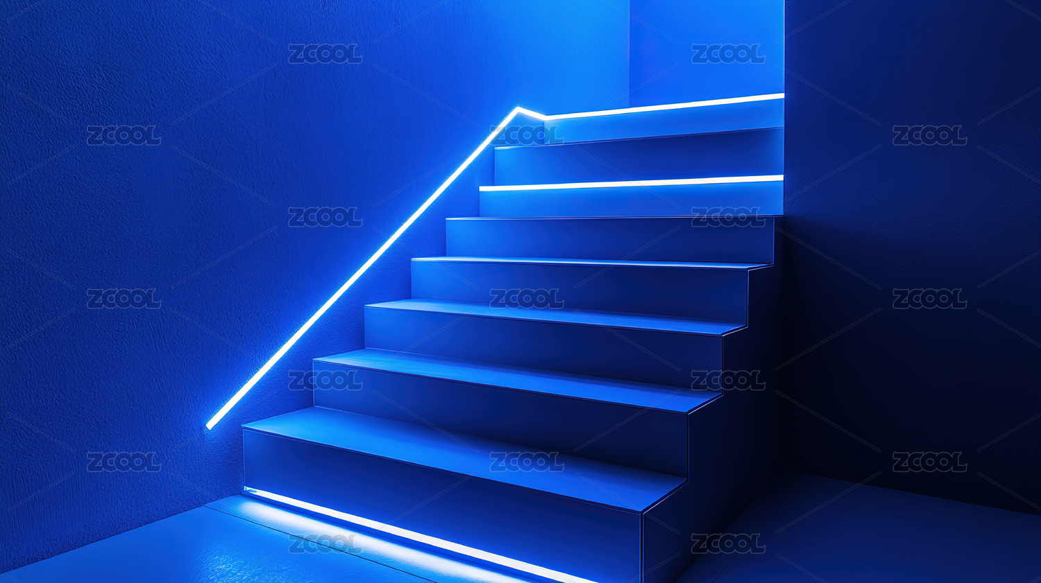 霓虹灯,蓝色光,楼梯,光效,现代设计,未来感,夜景,动感,对比,黑暗背景