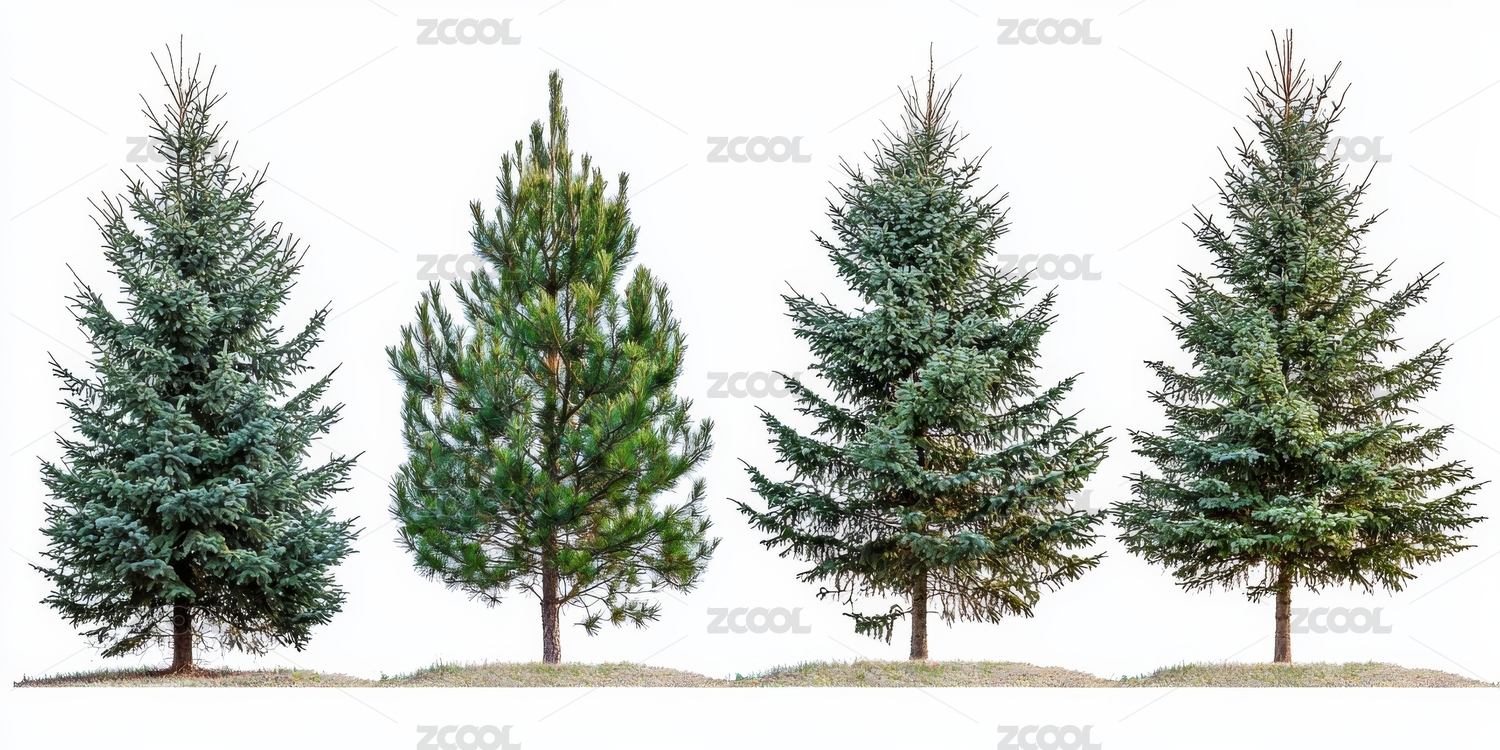 五棵绿色松树排列展示