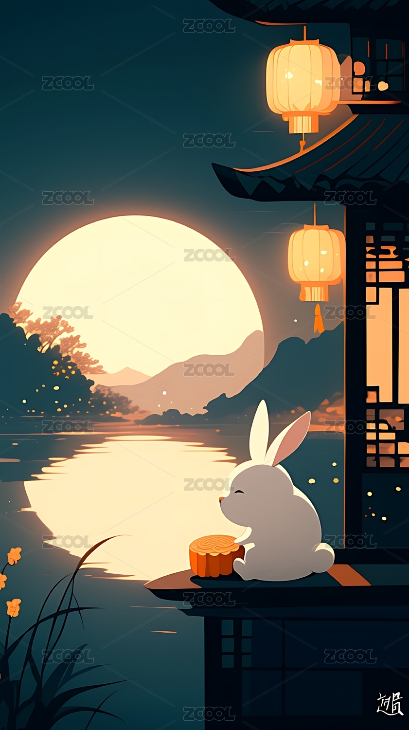 AIGC202403,玉兔,月亮,月饼,兔子,兔,插画,背景,卡通,扁平