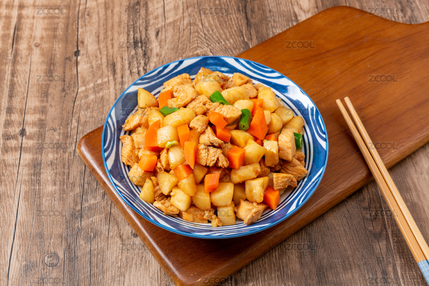 木桌背景一盘传统东北家常菜地三鲜