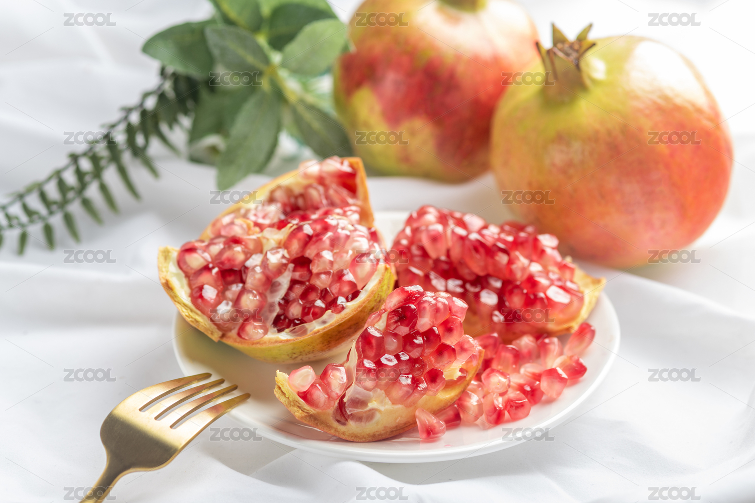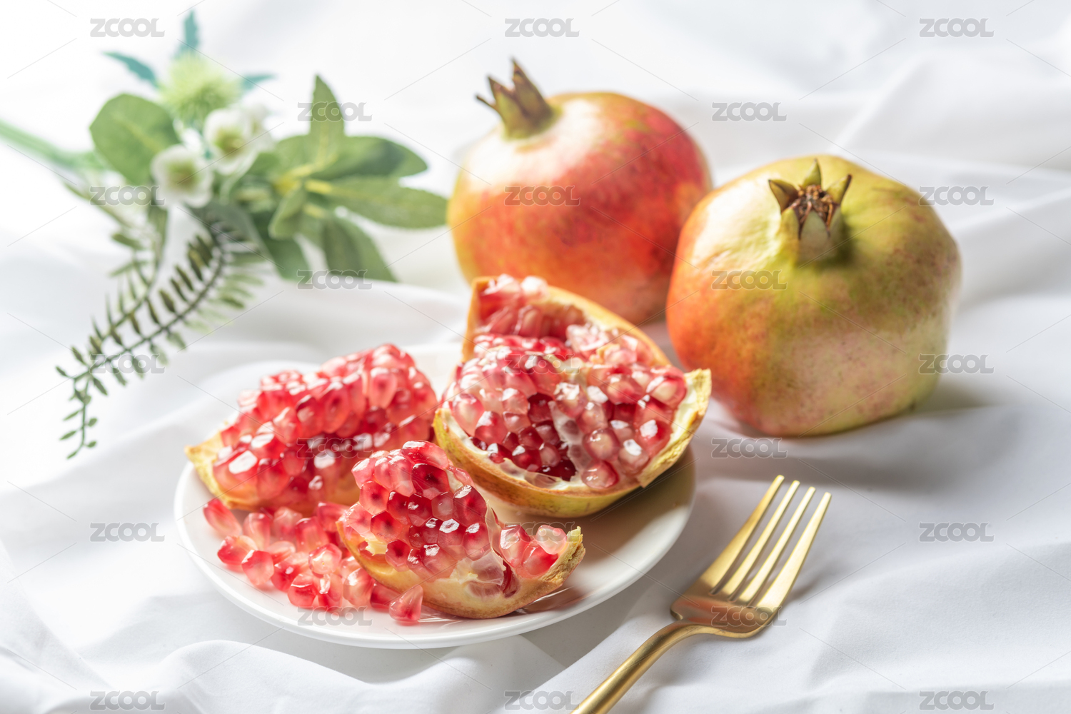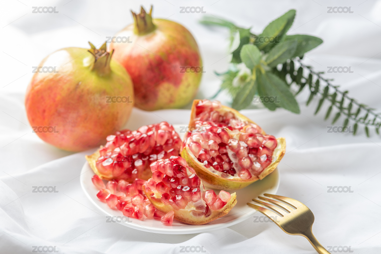 石榴,石榴籽,红石榴,多籽,石榴子,一盘,切开,金色叉子,水果,秋天