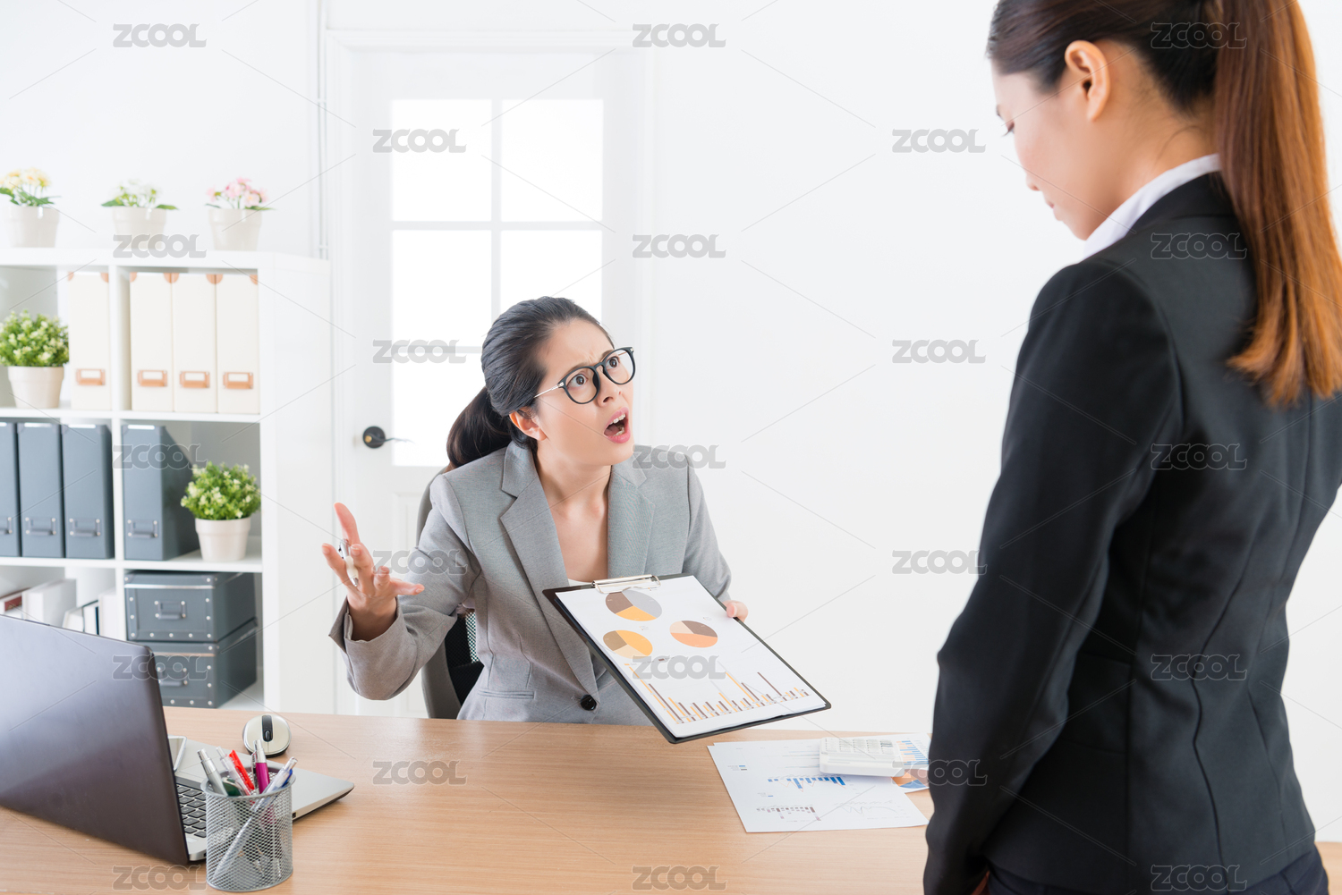 亚洲女老板混淆图项目,并要求员工指责的office lady workshit与她的手势和平均脸。她是不快乐的事心烦的问题。