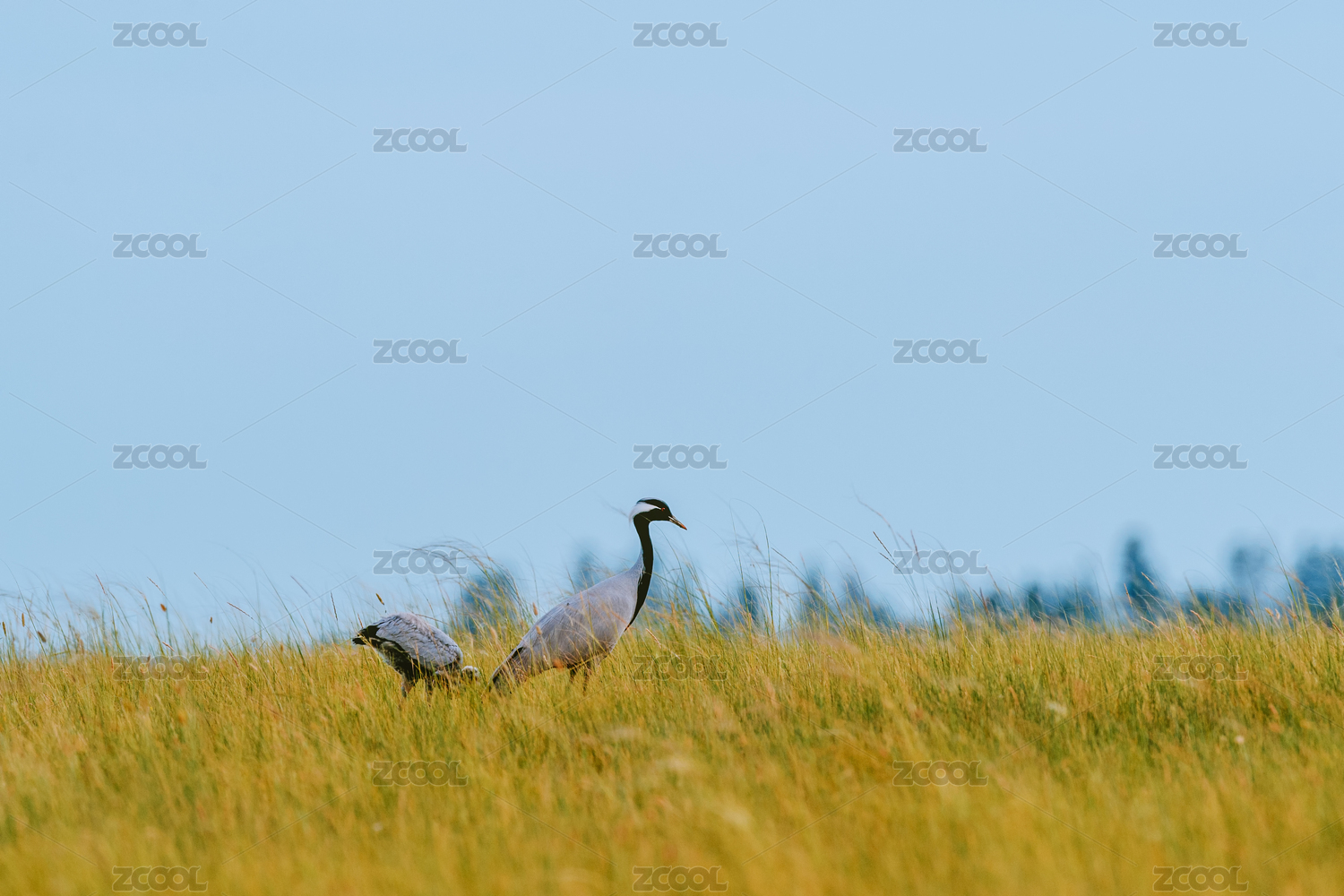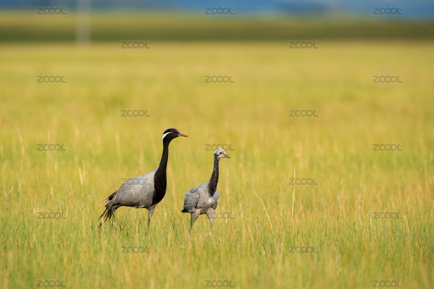 蓑羽鹤妈妈带着幼鸟在草原觅食