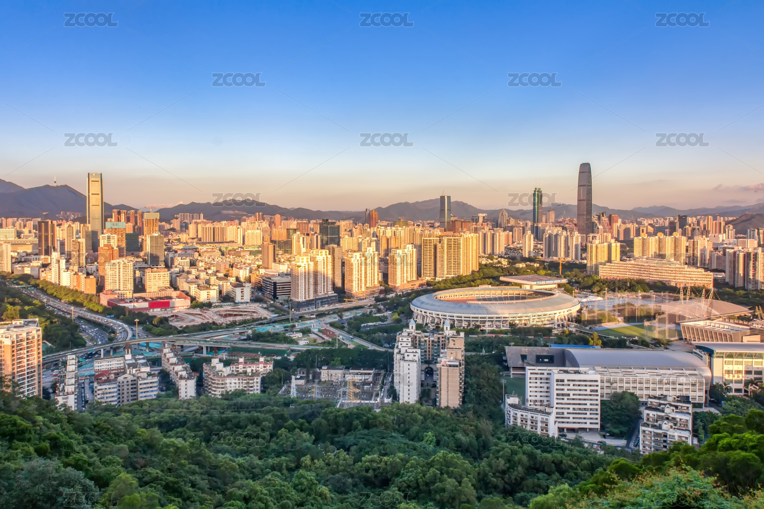 深圳笔架山俯瞰城市高楼建筑夕阳景观