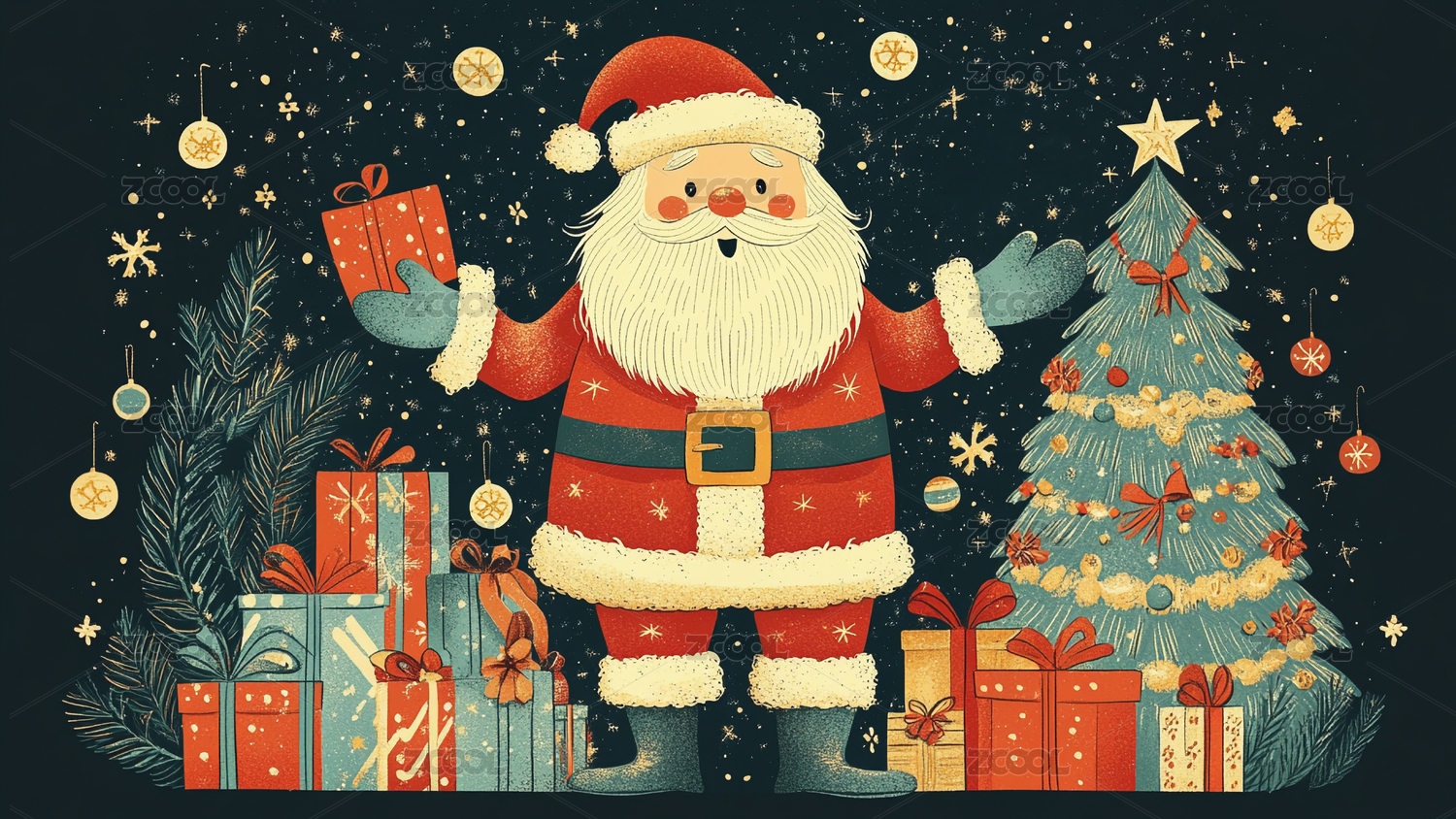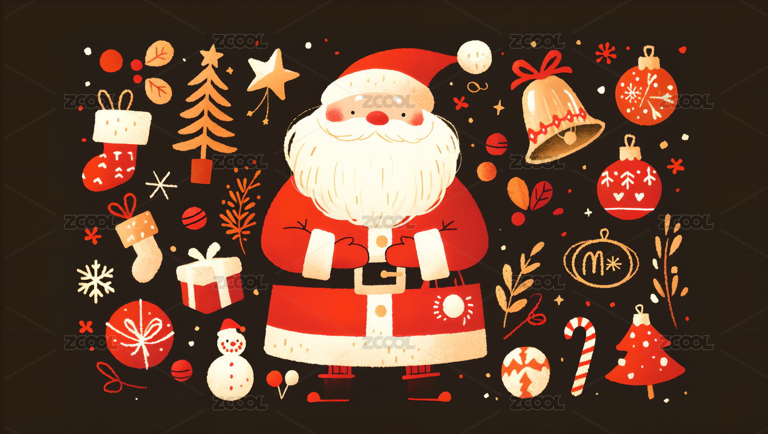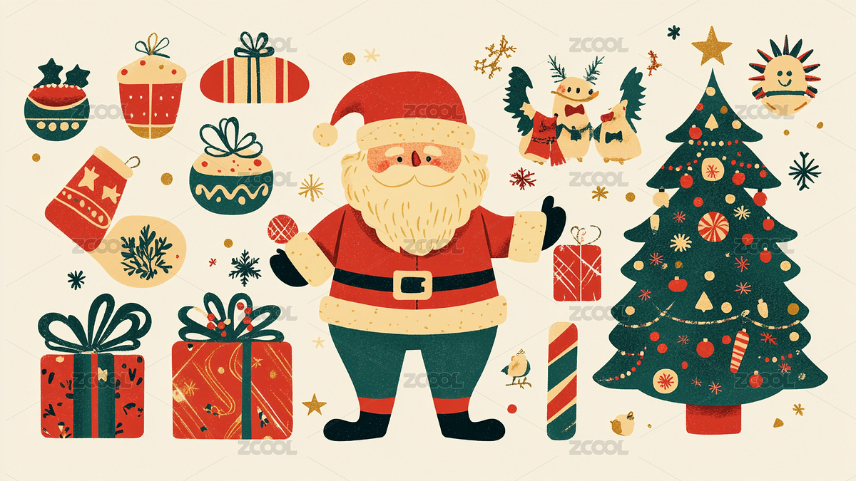 圣诞插画中的圣诞老人及元素