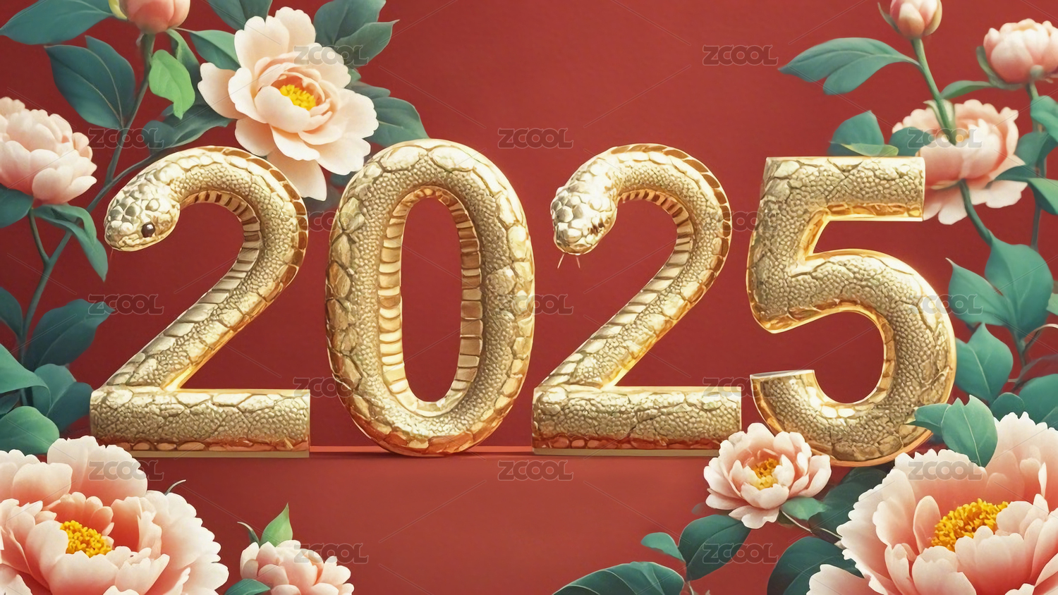 蛇年新年元旦“2025”节日喜庆牡丹花