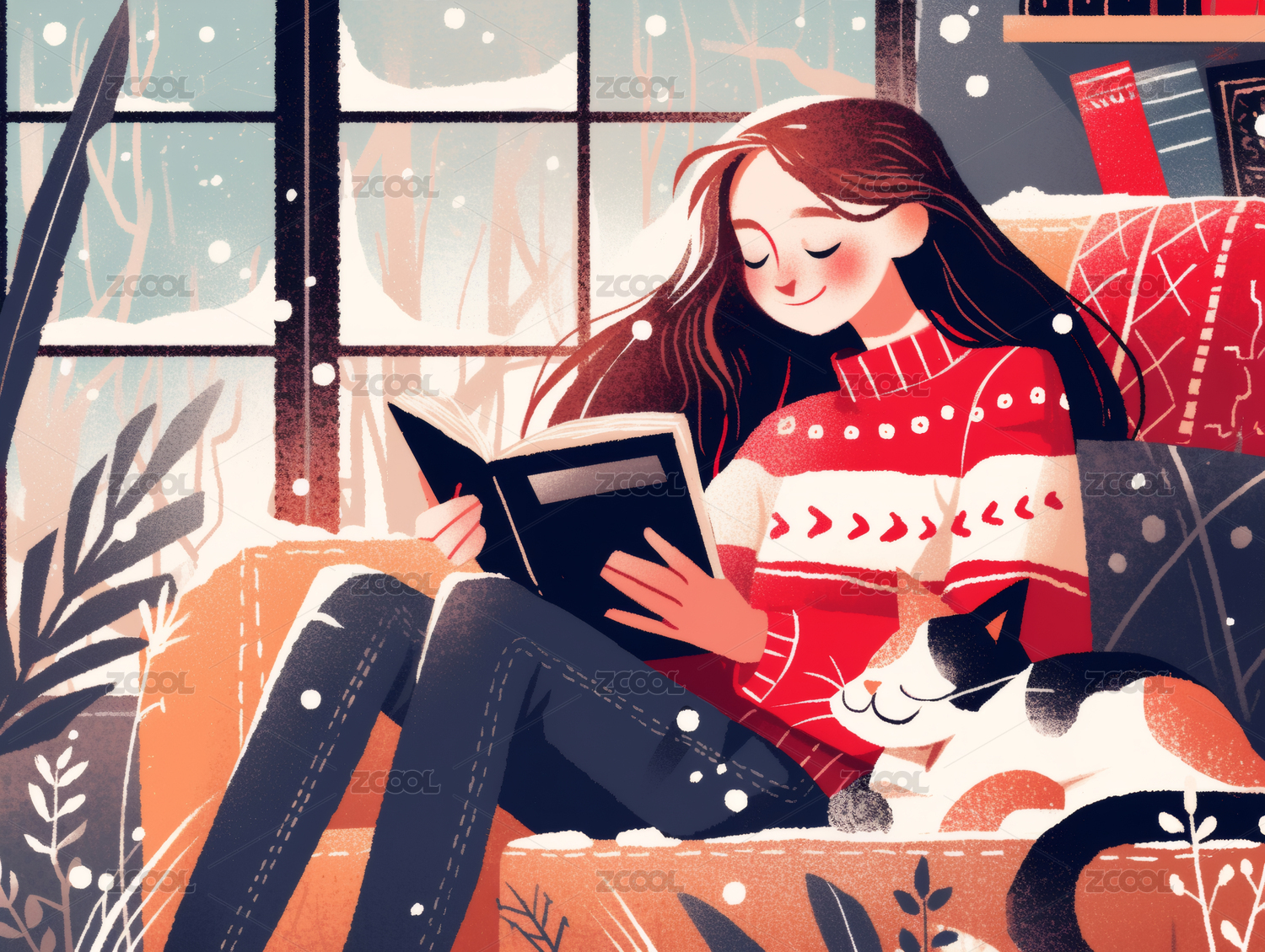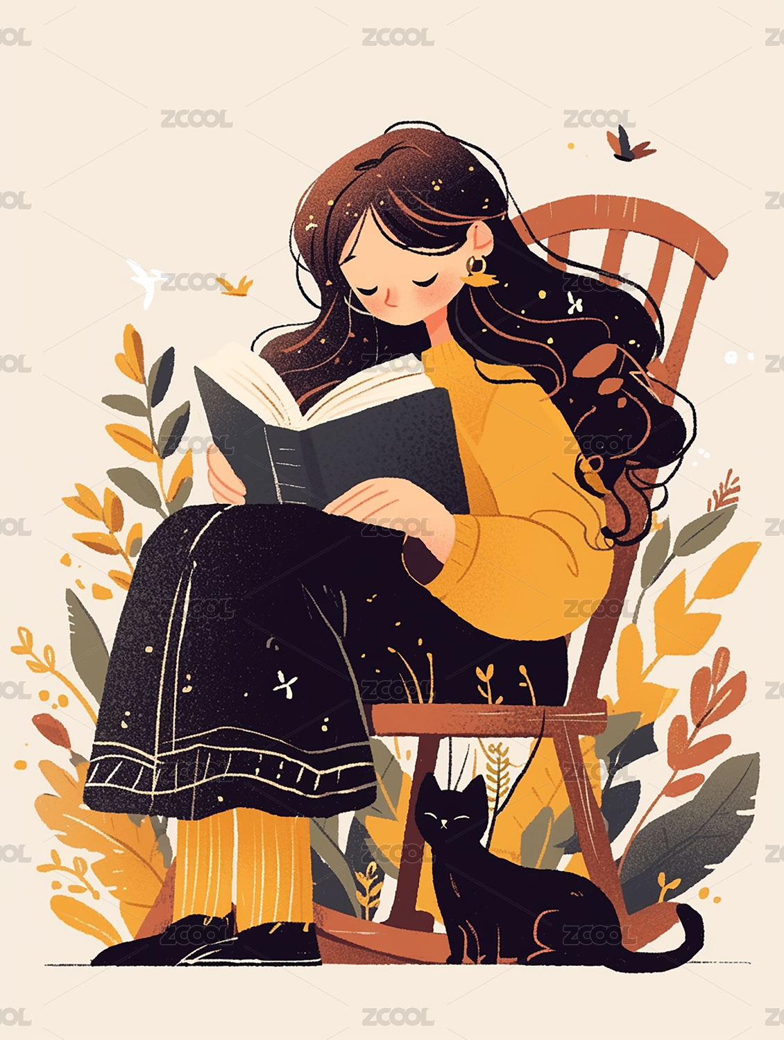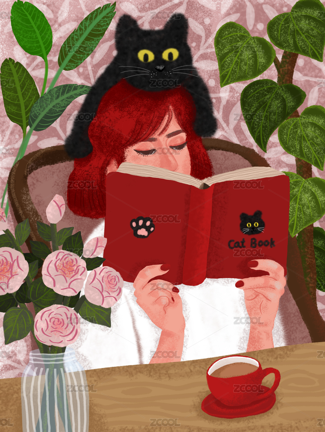 人,女人,坐,室内,椅子,插画,看书,喝酒,惬意,猫