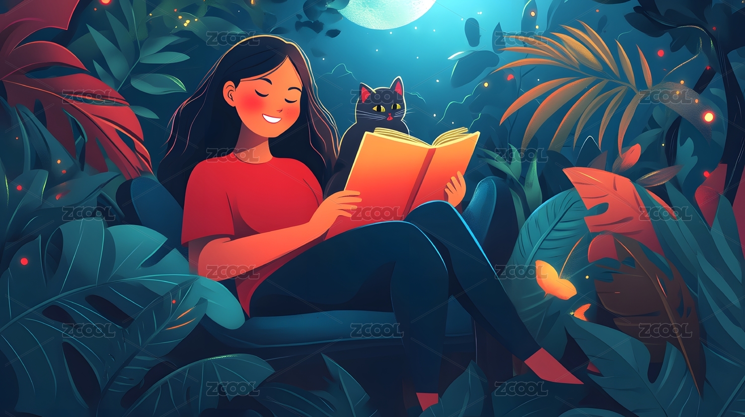 黑猫和女生正在看书周围是咖啡花和绿色植物