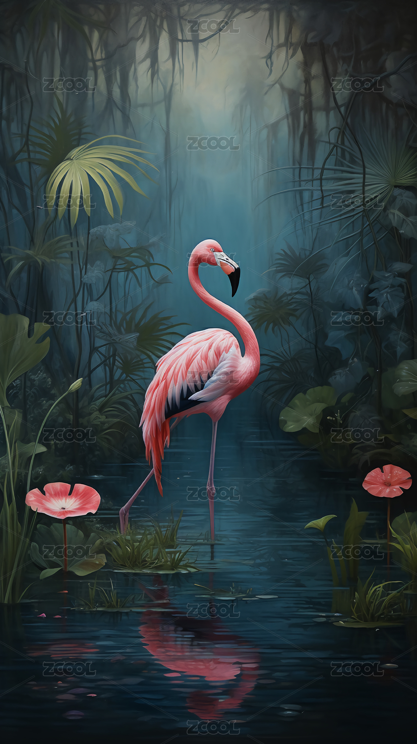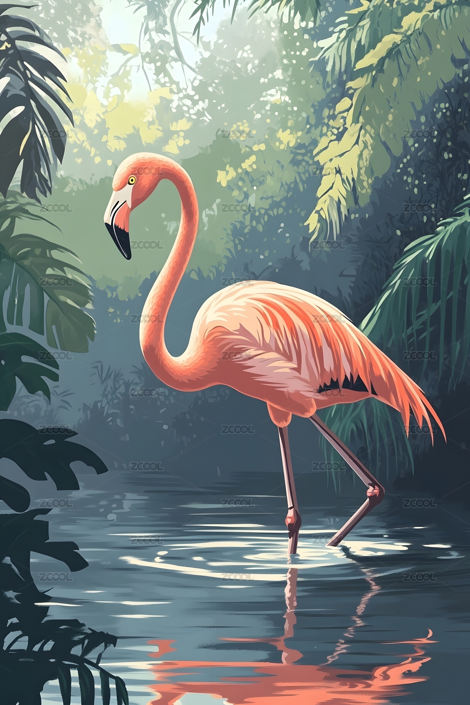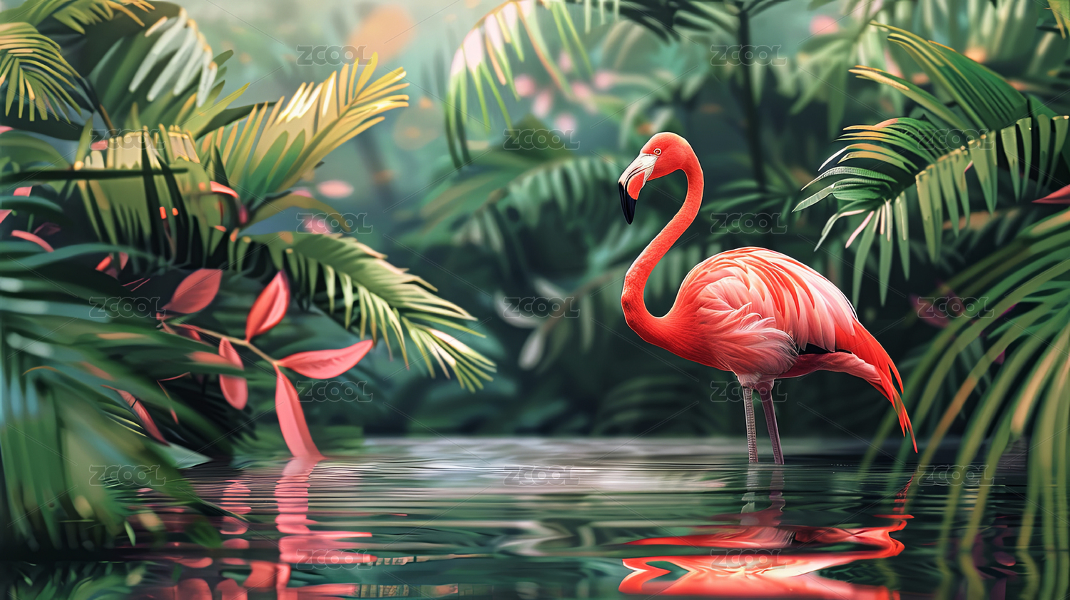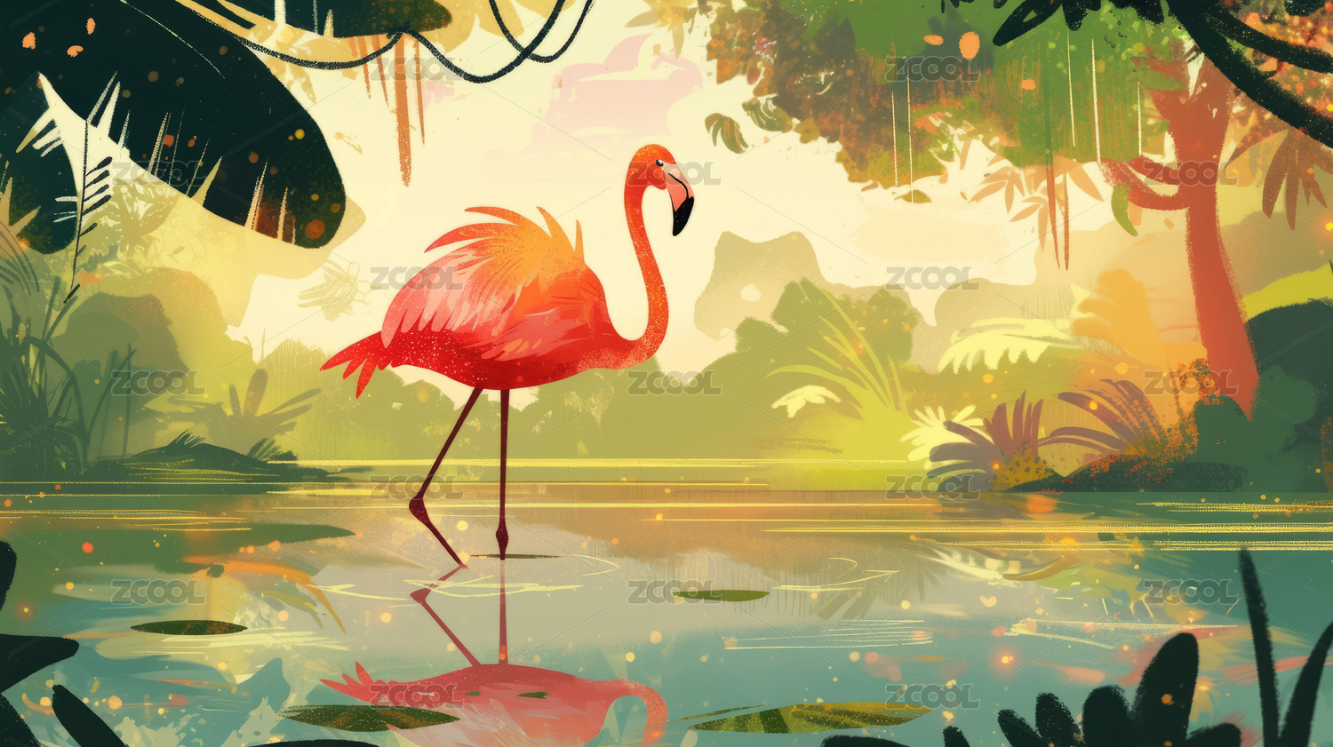 火烈鸟,鸟,动物,插画,壁纸,热带,植物,抽象,彩色,可爱