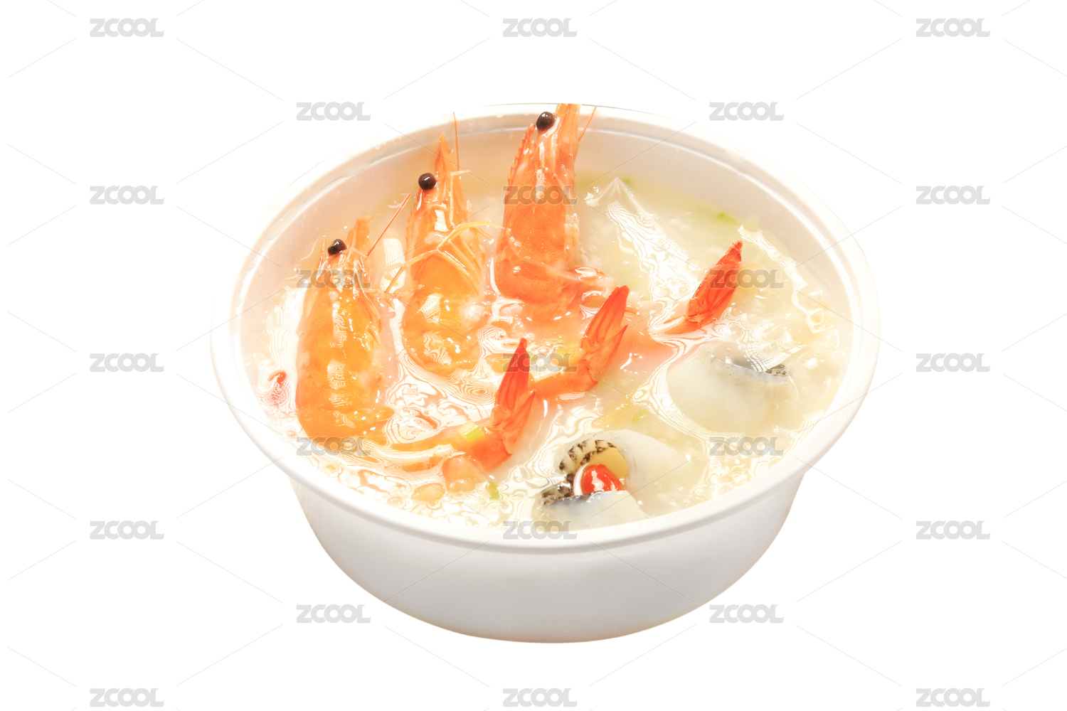 白色背景上白色打包盒中的鲜虾鱼片粥
