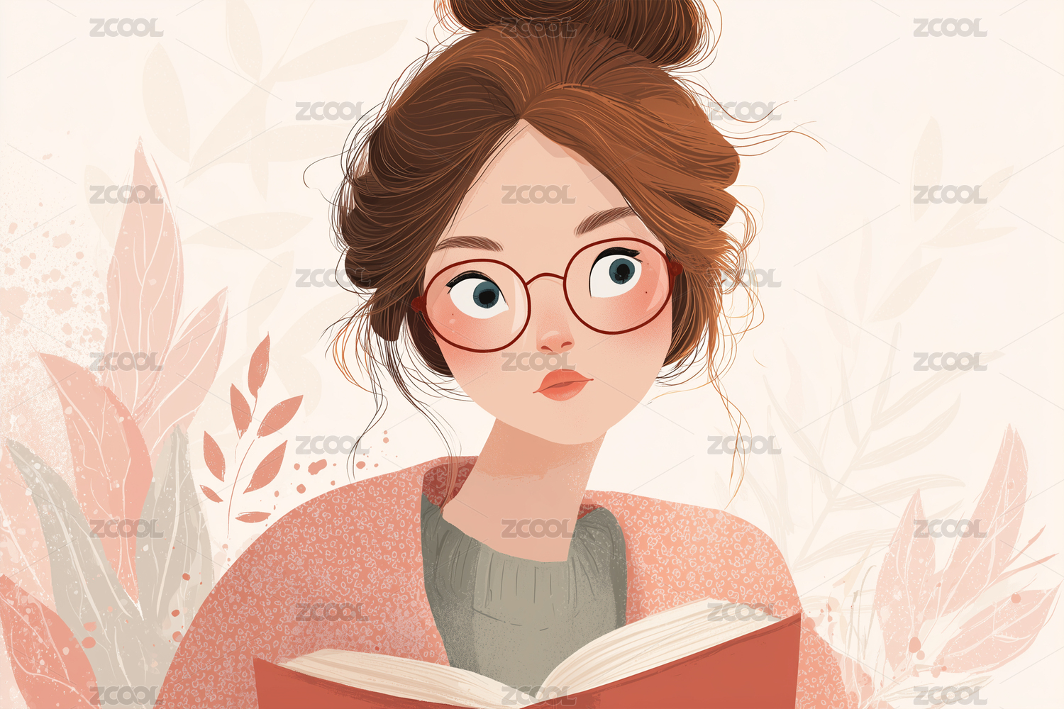 清新明亮白底胸前抱着书的亚洲女孩插画绘画