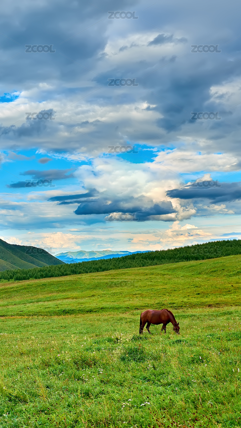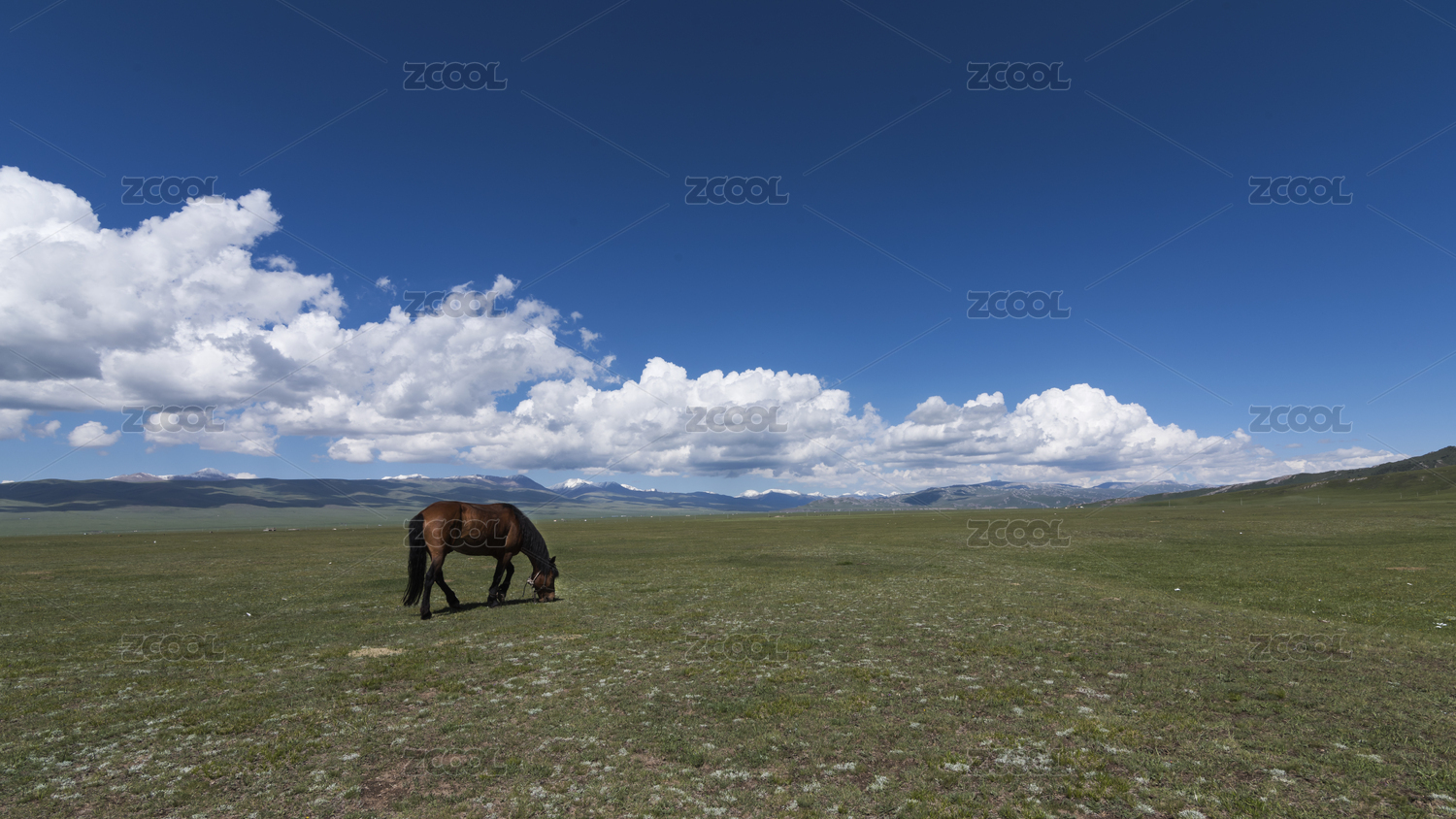 草原,马,马匹,一匹,一个,山脉,草地,山,蓝色,天空