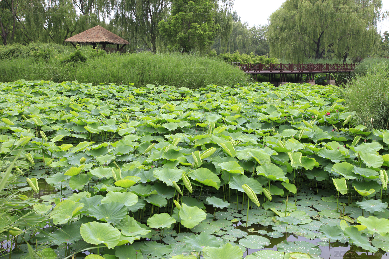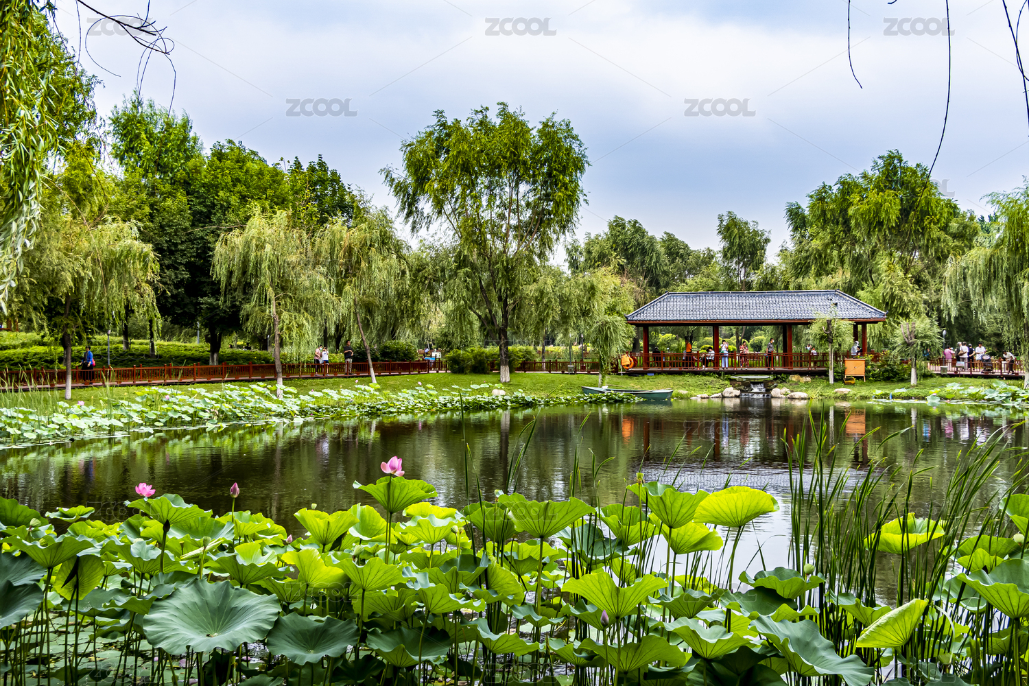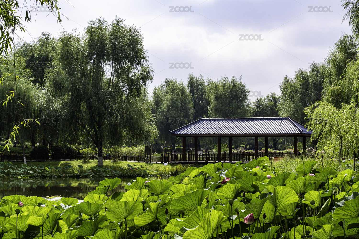 中国,长春,百花园,湖泊,水域,桥,亭子,树木,植物,荷花